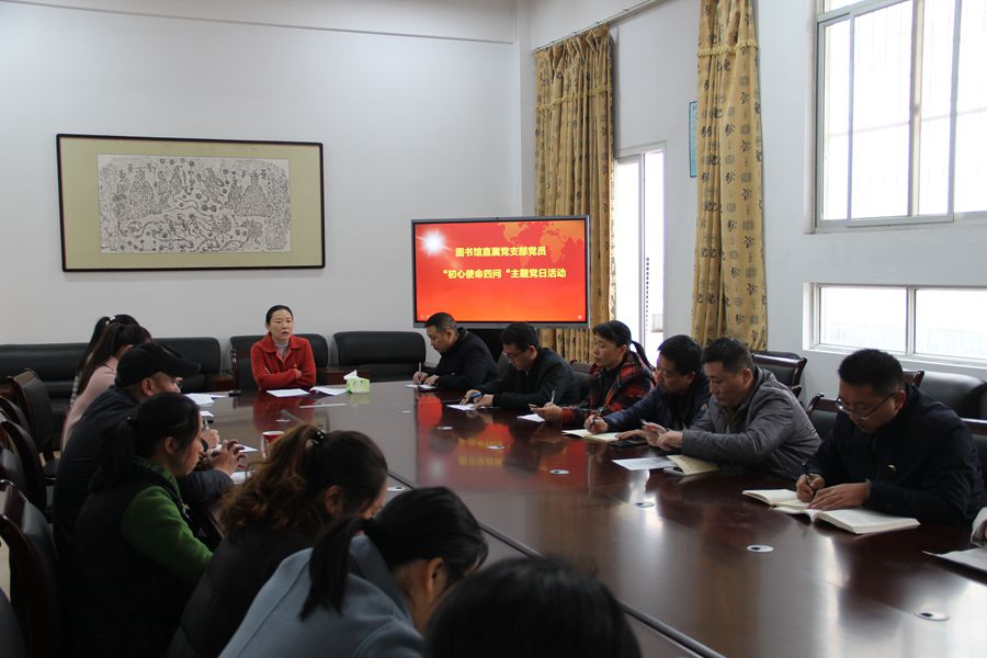 本网讯(文/图书馆 夏世龙)11月20日上午,图书馆直属党支部组织开展党员“初心使命四问”主题党日活动,全体党员参加活动,活动由党支部书记周青玲主持。