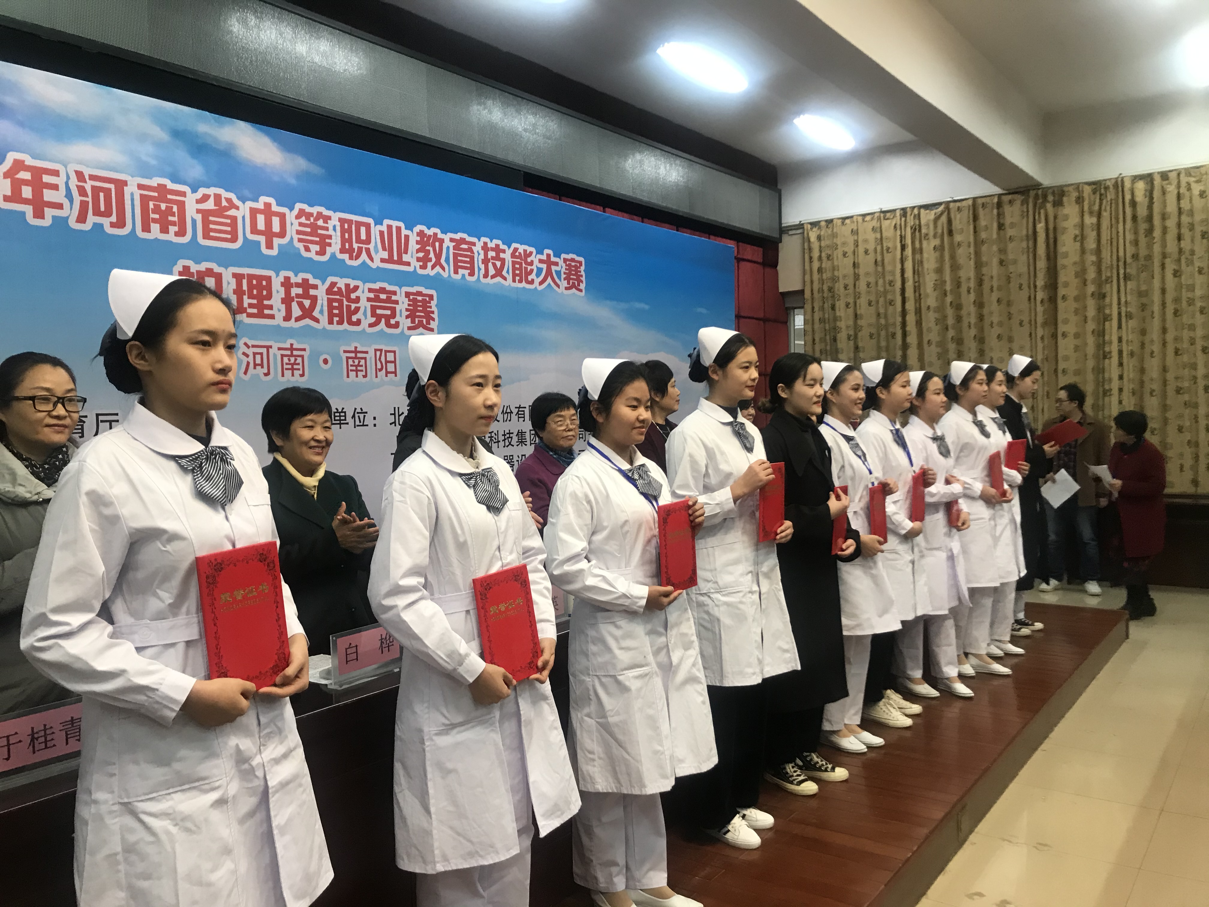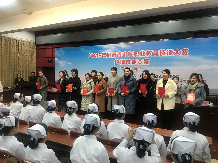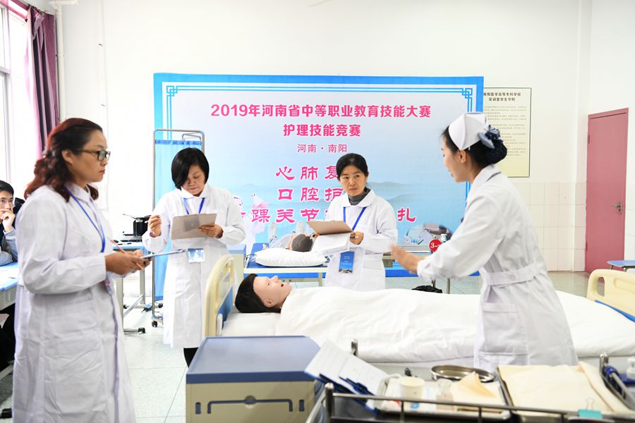 本网讯(文/护理系 李明哲)为进一步提高我省中等职业学校护理专业发展水平,深化各学校之间的交流与合作,日前,由河南省教育厅、河南省卫生健康委员会主办的2019年河南省中等职业教育技能大赛护理技能竞赛在我校成功举办。竞赛组委会特邀河南省卫健委科教处刘桂萍教授为比赛仲裁组组长,聘请了河南省肿瘤医院护理部主任刘东英等4位省级医院护理专家和2位南阳市级医院护理专家为竞赛裁判。赛场设在护理系实训楼2楼。