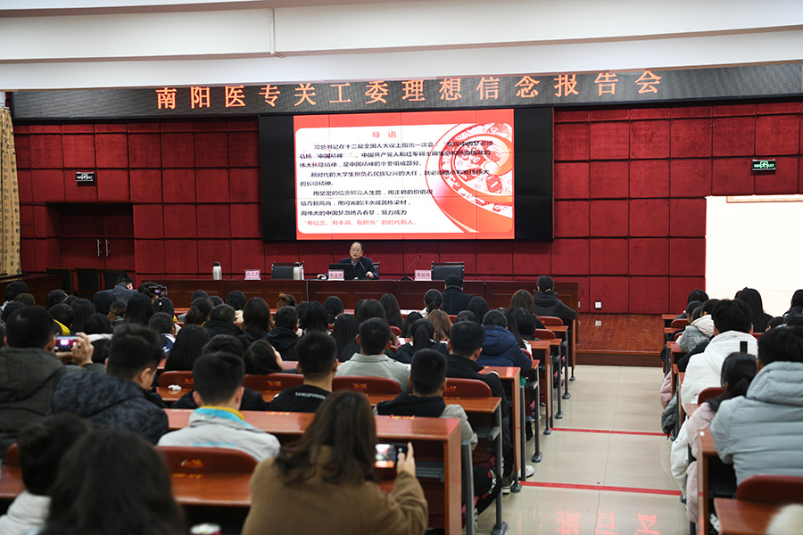 本网讯(文/离退处 朱迪)12月4日下午,我校关工委在仲景西区图书馆五楼报告厅举行理想信念报告会。特邀南阳医专关工委常务副主任、马克思主义哲学教授、原校党委副书记张金虎作报告,国际教育学院副院长范卫杰与近300名学生参加了报告会,报告会由南阳医专关工委秘书长、校离退休职工工作处处长张延艳主持。