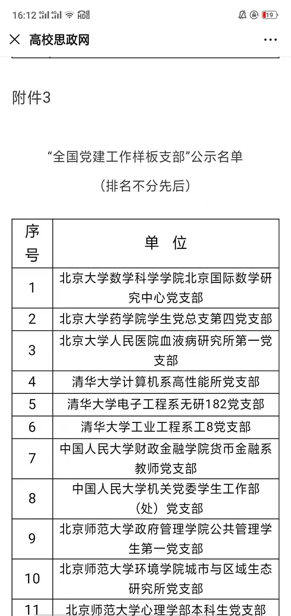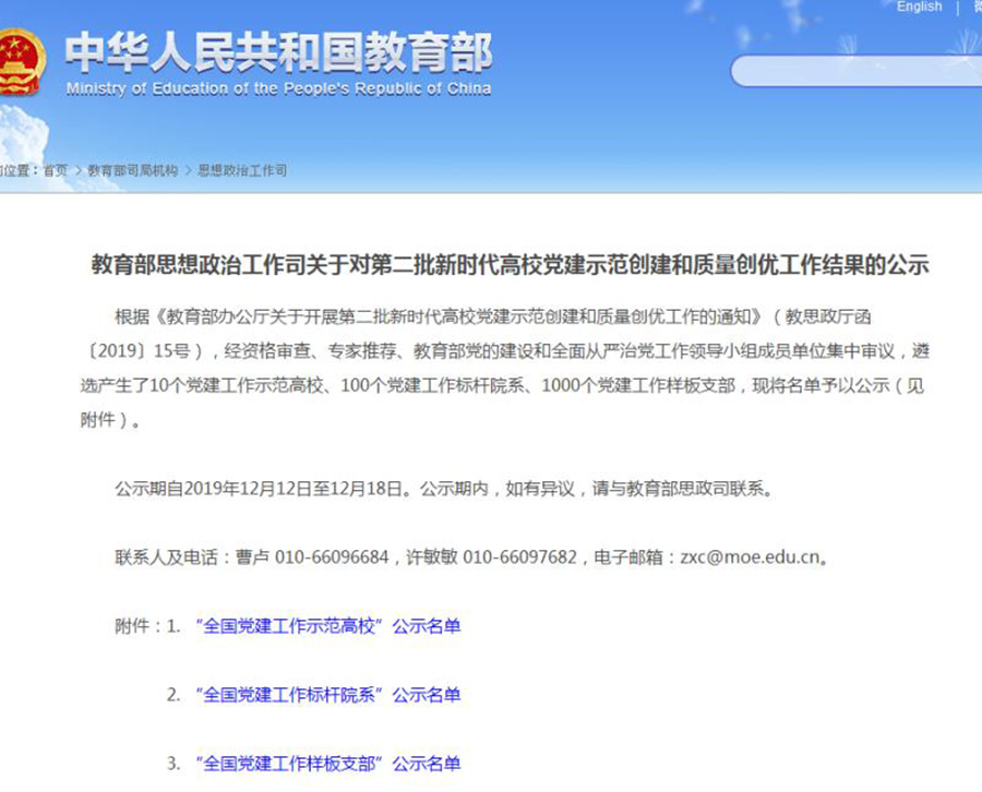 我校在教育部思想政治工作司关于对第二批新时代高校党建示范创建和质量创优工作遴选中获“全国党建工作样板支部”。