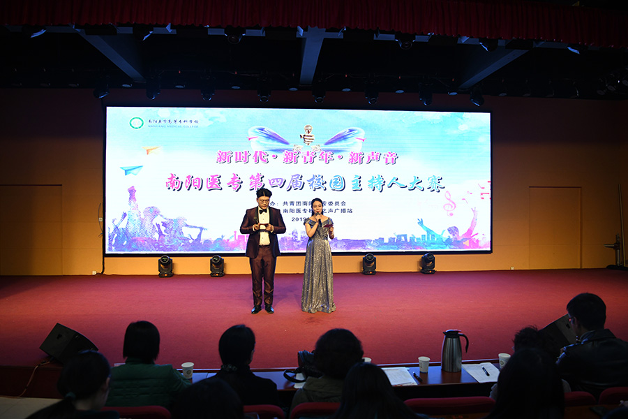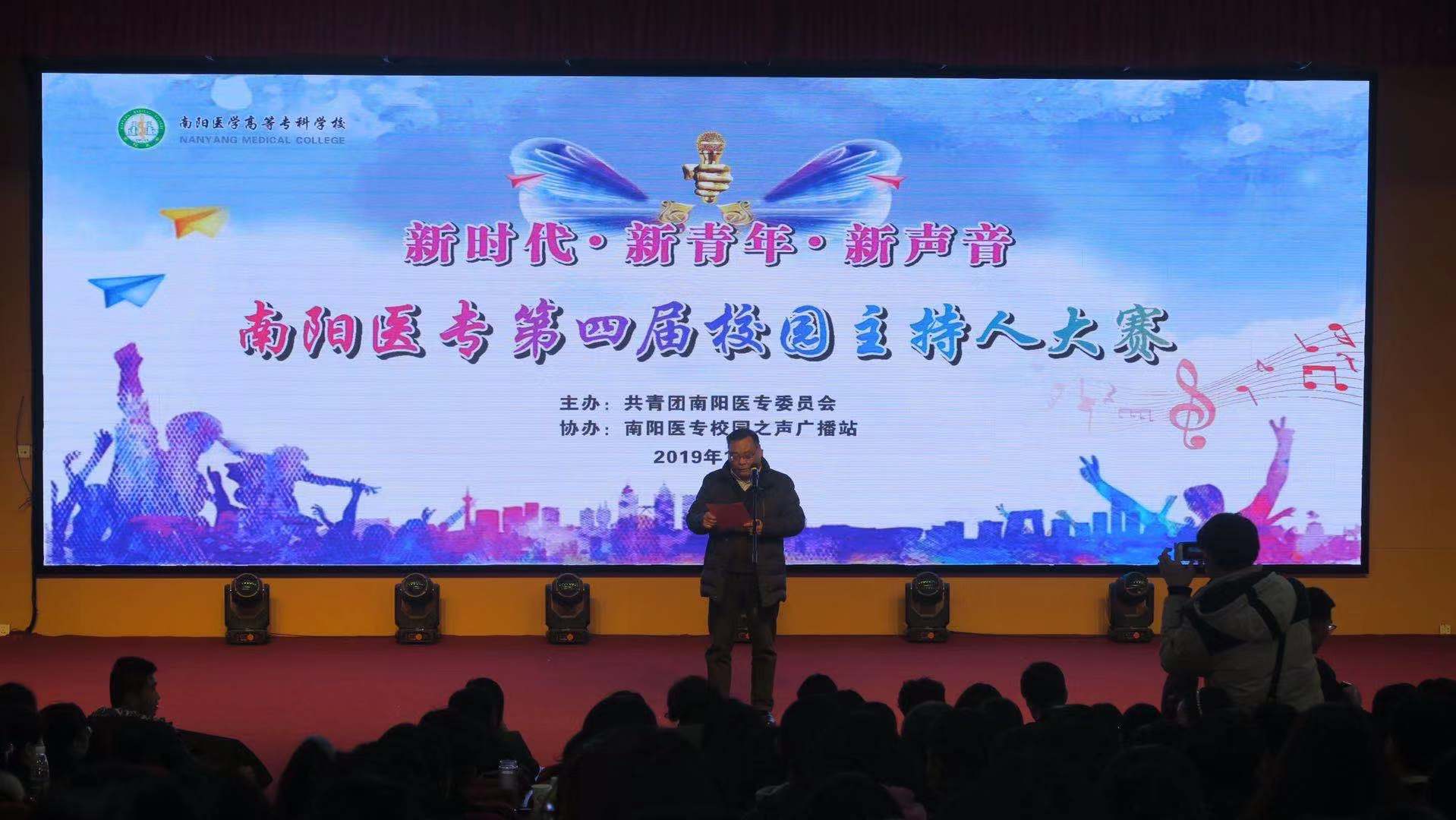 本网讯(文/校团委古婵婵)12月11号下午,由校团委主办、校广播站协办的“新时代,新青年,新声音”南阳医专第四届校园主持人大赛决赛在仲景东区学术报告厅隆重举行。校党委副书记逵应坤、校党委办公室主任杜晓平、总务处处长刘洋、校团委书记徐晓杰出席,党委办公室副主任王萍、党委组织部副部长孙超丽、工会女工部部长白峰、公共教学部副主任夏曼、对外交流合作处综合科科长周国军担任本次大赛评委,各涉学系(部、院)团总支书记、学生代表300余人观看了比赛。
