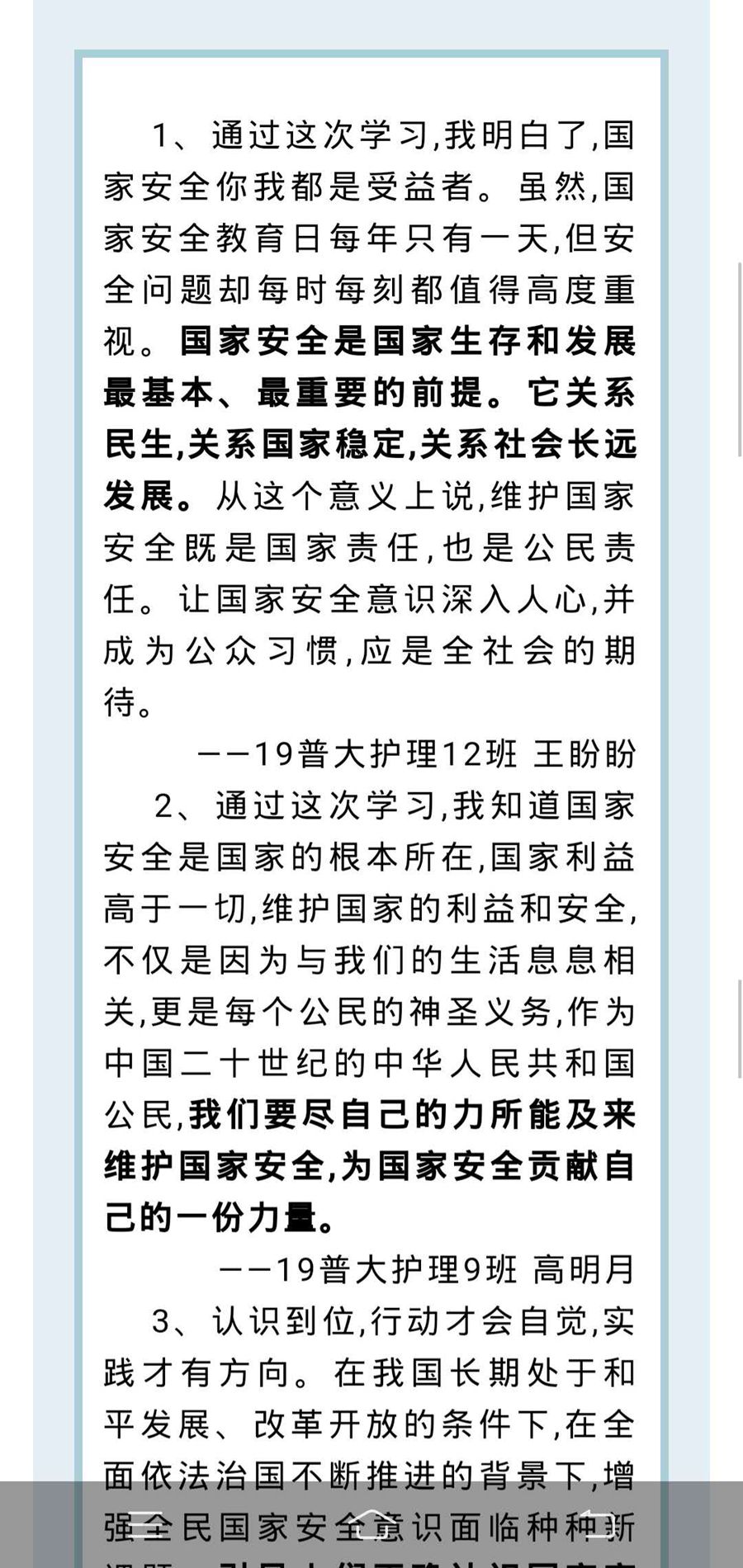 今年全民国家安全教育日活动的主题为“坚持总体国家安全观,统筹传统安全和非传统安全,为决胜全面建成小康社会提供坚强保障”。通过学习讨论,我校广大师生进一步增强了国家安全意识,提升了维护国家安全的自觉性和主动性,对我校学生思想政治教育和学风建设起到了良好的促进作用。