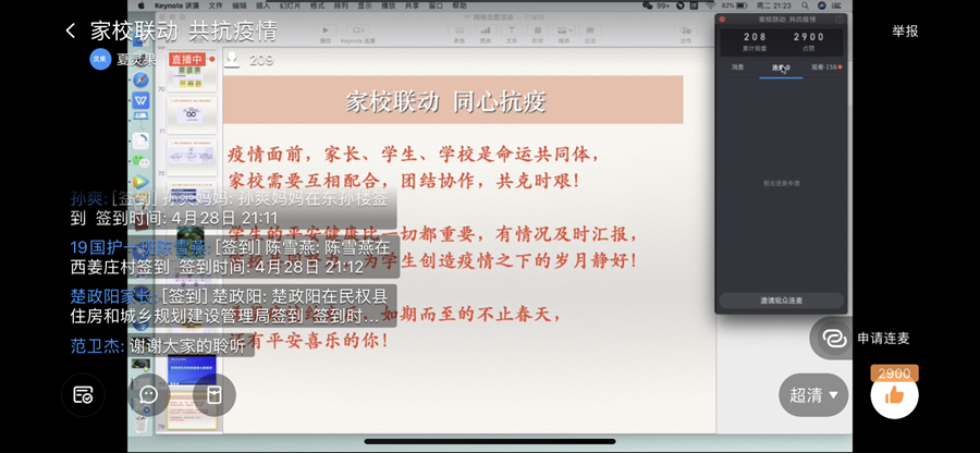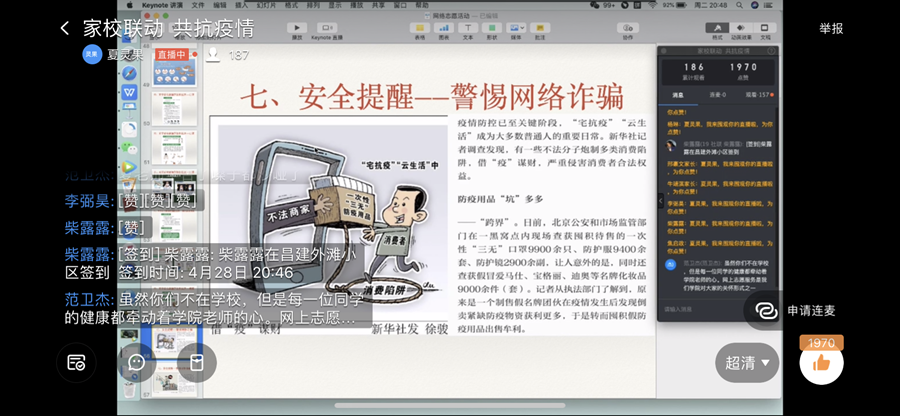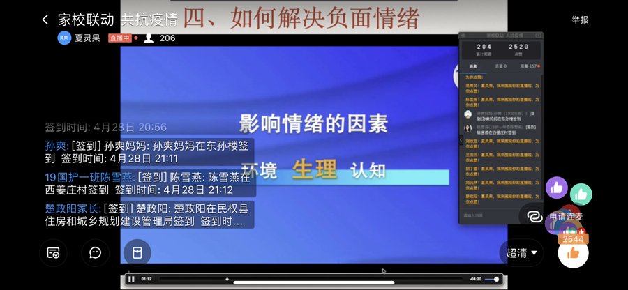 本次志愿服务分为“主题讲解”和“家校互动”两个环节。辅导员夏灵果老师首先讲解了“开学前后疫情防控注意事项”和“公众心理健康教育”知识,随后进行了网络互动。针对家长、学生提出的复学后的安全和管理等问题,学院领导、老师逐一解答。