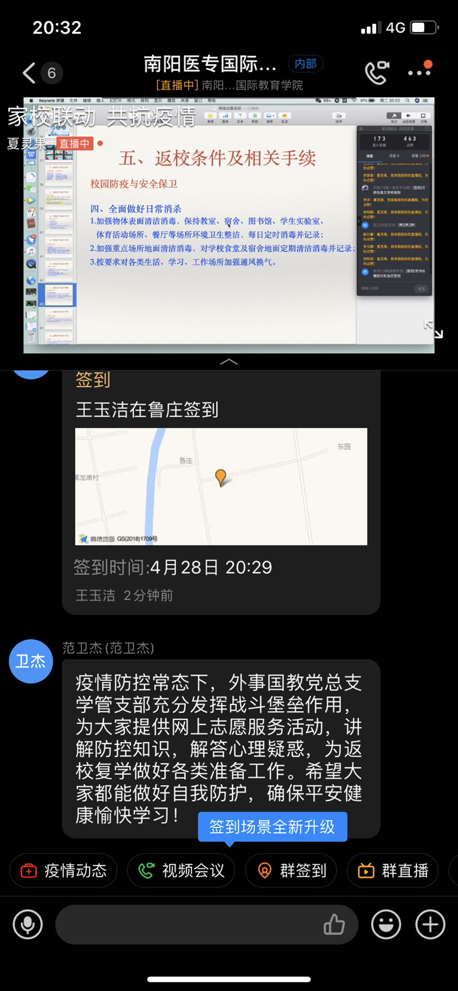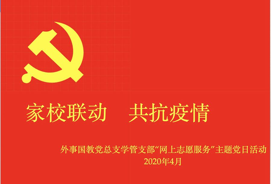 本网讯(文/国际教育学院夏灵果)外事国教党总支学管支部积极发挥支部引领作用,利用家校育人平台,立足大学生特点,结合工作实际,强化师生教育引导,于2020年4月28日晚利用钉钉平台开展“家校联动,共抗疫情”网上志愿服务主题党日活动。学管支部全体教职工、部分家长和学生代表参加。