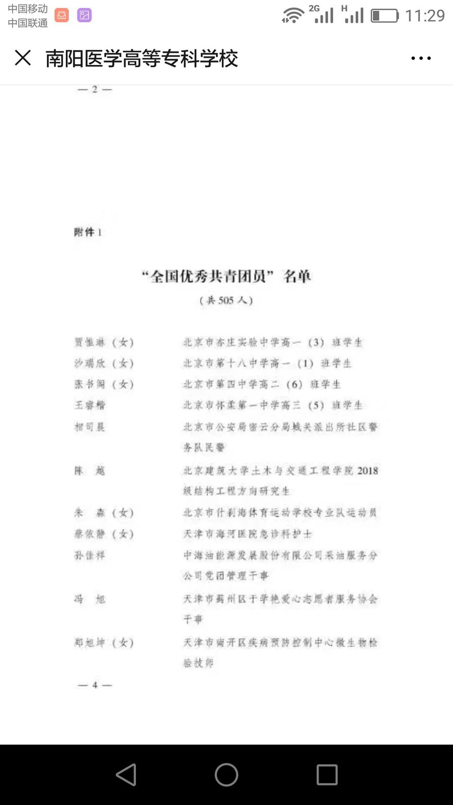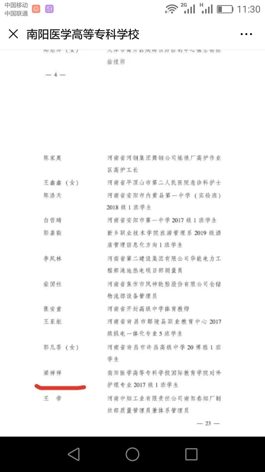 本网讯(文/校团委 马黎莉)五四青年节前夕,共青团中央下发了《共青团中央关于表彰“全国优秀共青团员”“全国优秀共青团干部”“全国五四红旗团委(团支部)的决定”》(中青发[2020]8号)。我校国际教育学院2017级护理专业学生梁祥祥,在中国人民解放军南部战区总医院实习期间,突遇新型冠状病毒肺炎疫情爆发,他放弃春节假期,主动请缨到发热门诊一线参与疫情防控工作,由于表现优秀,被共青团中央评为“全国优秀共青团员”——全国共青团员的最高荣誉,这是我校共青团员首次获此殊荣。2020年5月6日《南阳日报》以《绽放青春风采 彰显责任担当——记“全国优秀共青团员”南阳医专学生梁祥祥》为题刊登了梁祥祥的感人事迹。