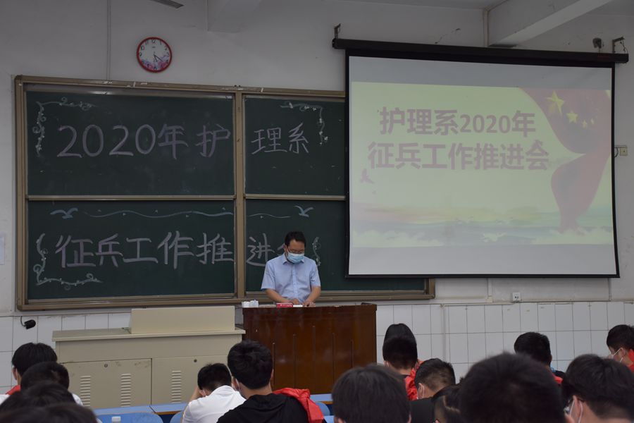 本网讯(文/护理系朱青)为扎实推进大学生应征入伍工作,5月25日下午,护理系在2号教学楼201教室举行2020年征兵工作推进会暨表彰活动。护理系党总支书记梁顺平、党总支副书记宗山林、学工办主任闫珂、部分辅导员以及2018级百余名男生参加了会议。