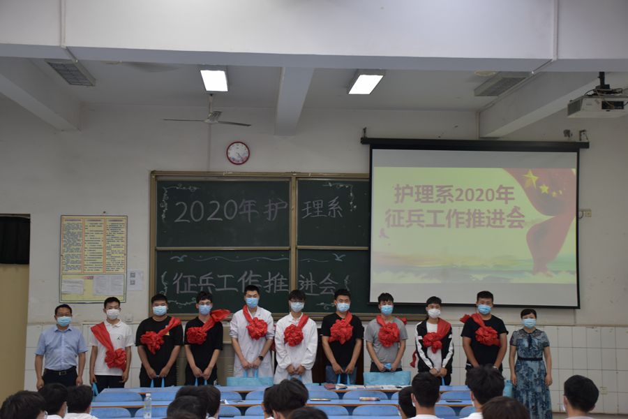 会上,播放了《好男儿就是要当兵》等2020年征兵宣传片,画面中战士们饱满的热情、响亮的口号以及整齐划一的步伐深深震撼了在场的男生,激发了同学们的参军热情。宗山林宣读了《护理系关于表彰2020年应征入伍优秀大学生的决定》,授予王江山等20名学生“护理系应征入伍优秀大学生”荣誉称号并颁发奖品,以资鼓励。