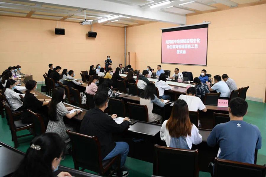 本网讯(文/党办 杨晓兵)9月20日上午,疫情防控常态化学生教育管理服务工作座谈会在南阳医专体育训练馆一楼会议室召开。党委书记全新明,副书记逵应坤,党委委员、副校长张国良、郭万周出席会议;相关部门负责人,系(部、院)负责同志,学生代表(含网格化管理员)参加会议。