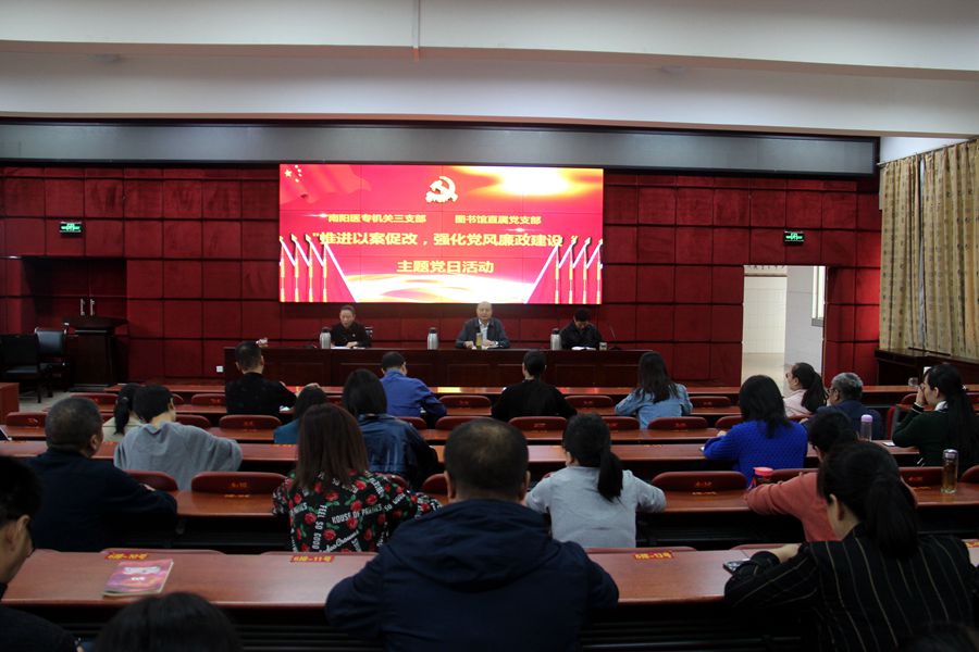 本网讯(文/图书馆 张登军)9月17日上午, 机关三支部、图书馆党支部在仲景西区图书馆五楼学术报告厅开展了以“推进以案促改,强化党风廉政建设”为主题的党日活动。校党委委员、副校长张胜海和机关三支部、图书馆党支部全体党员干部参加活动。