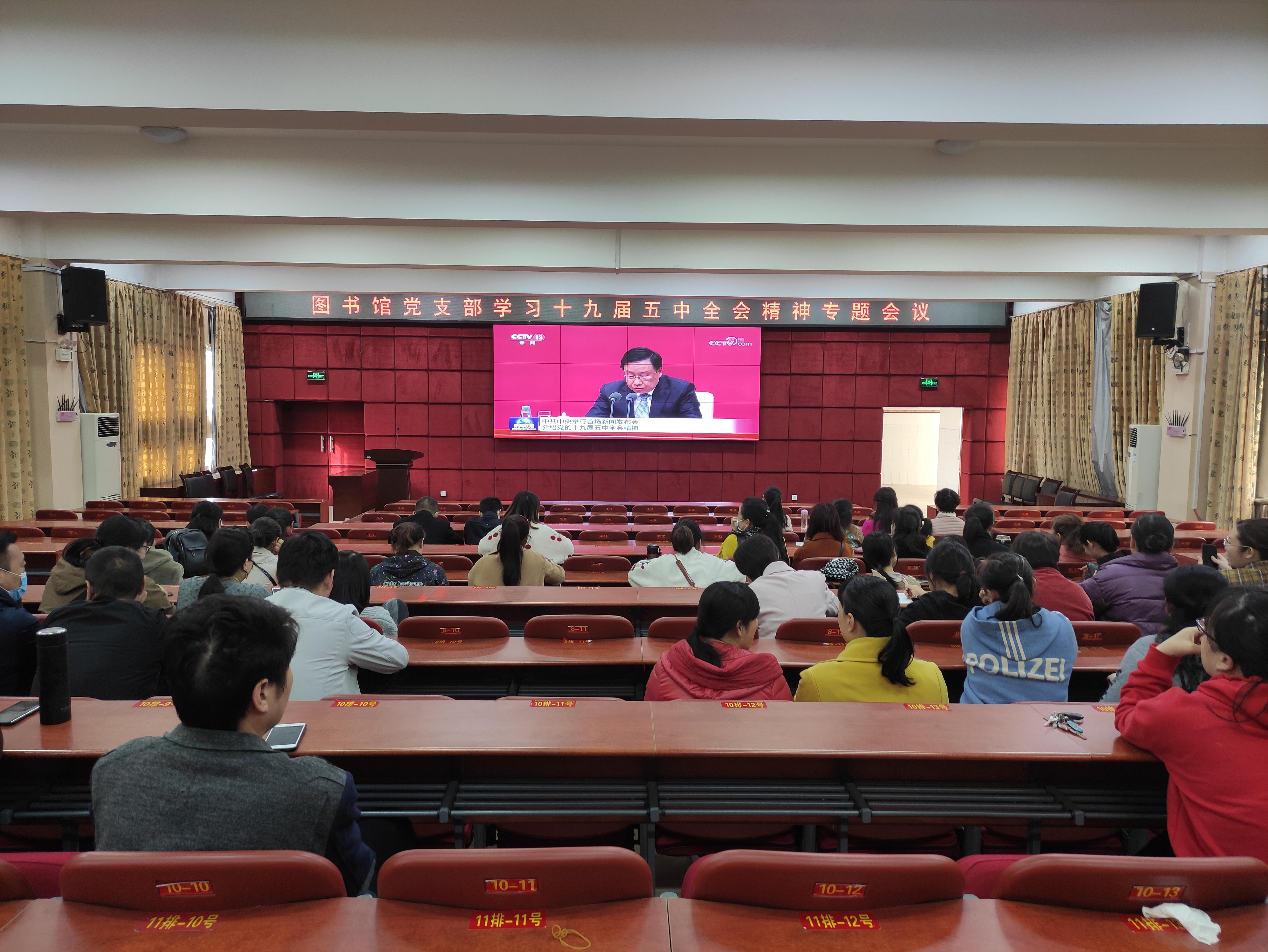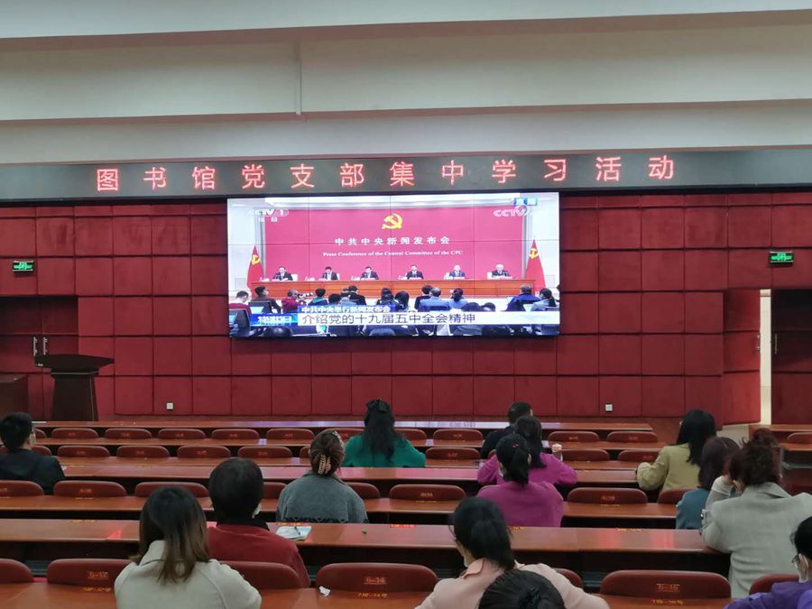 本网讯(文/图书馆 张登军) 10月30日上午,中共中央举行新闻发布会,解读党的十九届五中全会精神。图书馆党支部第一时间组织全体党员干部集中收看,认真学习领会。