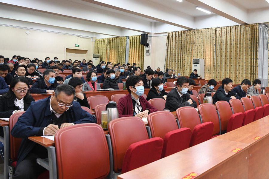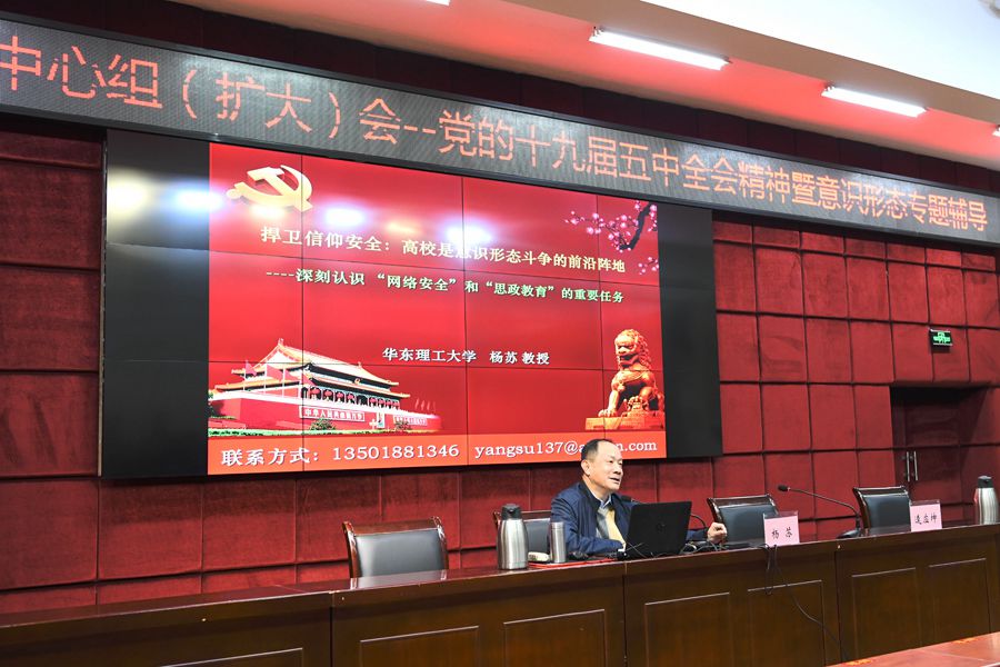 本网讯(文/宣传部  潘晓红深入学习贯彻党的十九届五中全会精神和习近平总书记关于意识形态工作的指示精神,11月18日下午,我校召开党委理论学习中心组(扩大)会议,特邀华东理工大学马克思主义学院原副院长杨苏教授作题为《捍卫信仰安全:高校是意识形态斗争的前沿阵地——深刻认识 “网络安全”和“思政教育”的重要任务》的专题辅导报告。校领导班子成员、中层干部、基层党组织委员、政教部专兼职教师、全体辅导员、三所附院书记或院长及分管领导近300人参加了报告会。会议由党委副书记逵应坤主持。