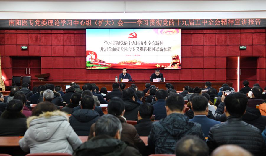 本网讯(文/宣传部 潘晓红)为深入学习贯彻党的十九届五中全会精神,12月16日下午,我校召开党委理论学习中心组(扩大)会议,特邀南阳市委宣讲团成员、市统计局党组书记、局长秦守国作专题辅导报告。校领导班子成员、中层干部、基层党组织委员、政教部专兼职教师、全体辅导员、三所附院书记或院长及分管领导、青马班学生近300人参加了报告会。会议由党委副书记逵应坤主持。