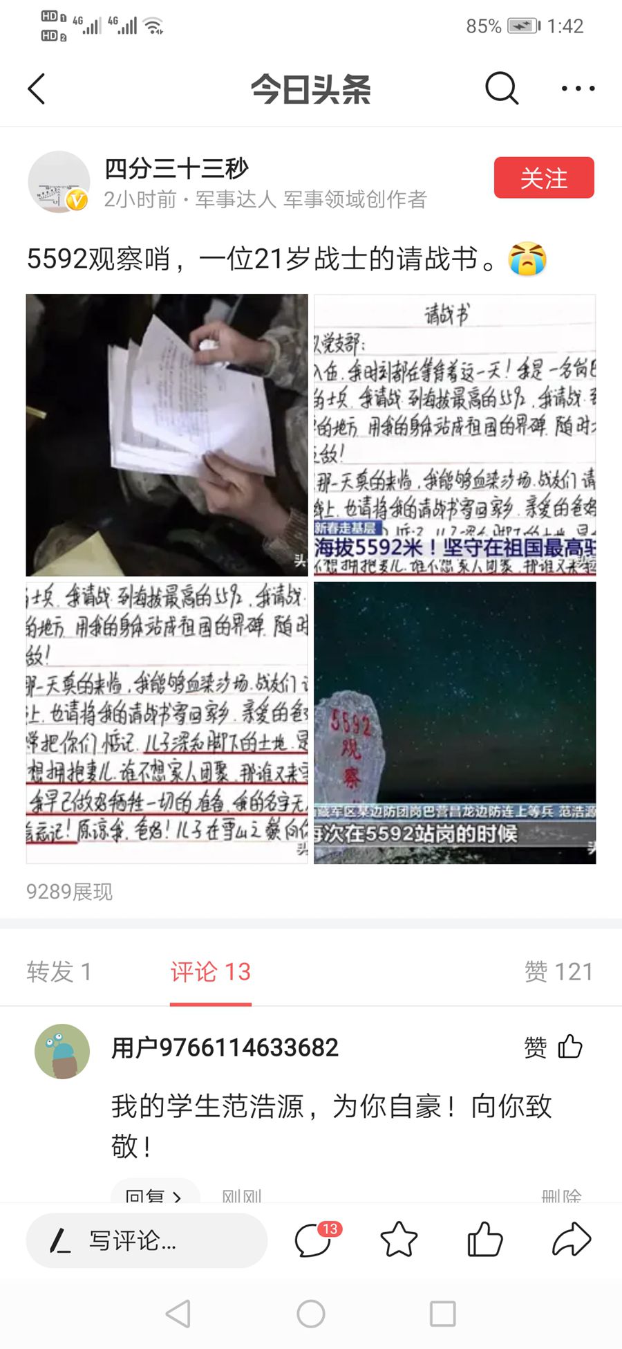 新闻播出后,边防战士不畏严寒,坚守祖国边疆最高驻兵点,他们不怕吃苦,缺氧不缺精神,海拔高境界更高,为祖国站岗放哨的事迹感人至深。我校广大师生纷纷热议并留言:我们也想去,即便爬不上5592,也为他们做点后勤工作;看的热泪盈眶……为我们的学生自豪;好男儿志在保家卫国,向5592致敬!……,有同志还即兴写诗:高山巍巍镇边关,积雪漫漫烁望眼。英雄何问立奇功?壮士报国守边关!----赞范浩源同学及守卫边关将士。