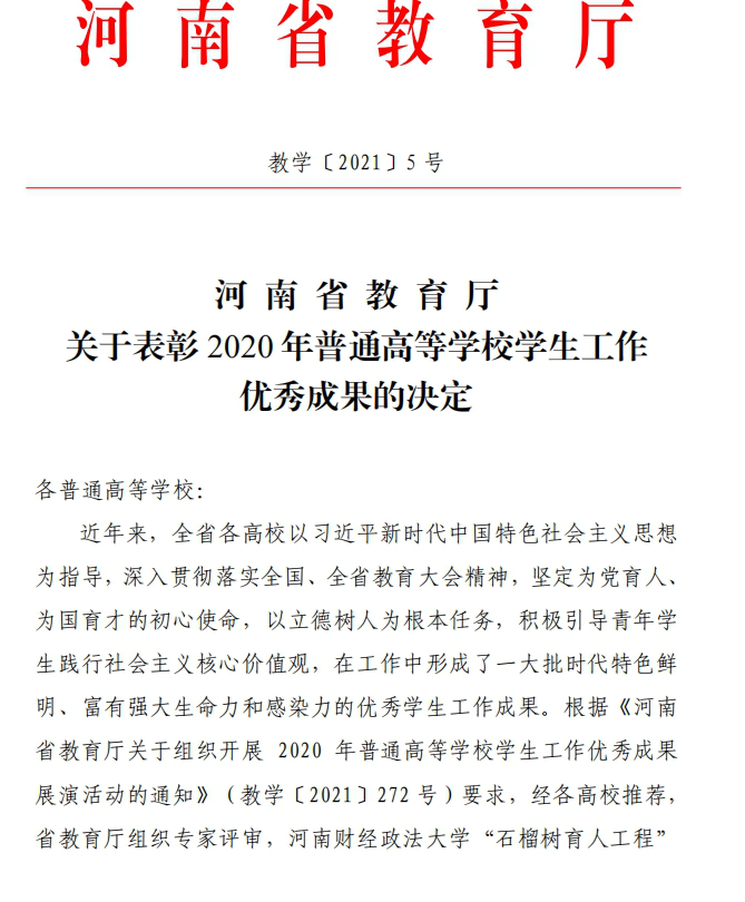 本网讯(文/护理系 闫珂)近日,河南省教育厅下发《关于表彰2020年普通高等学校学生工作优秀成果的决定》,我校由护理系申报的《“滴灌”育人, 绿色成长》项目获评2020年河南省普通高等学校学生工作优秀成果二等奖。