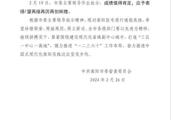 近日,中共南阳市委督查委员会下发《关于对南阳医学高等专科学校进行表扬的通报》(宛督委〔2024〕51号),通报了我校2023年在多个方面取得的显著成绩:获得省级以上荣誉30余项,建成两个全国性产教融合共同体,成立全省首家心血管技术培训中心,在全省高校中率先开展县市、乡镇订单定向医学生培养,为南阳经济社会发展和现代化省域副中心城市建设做出积极贡献。