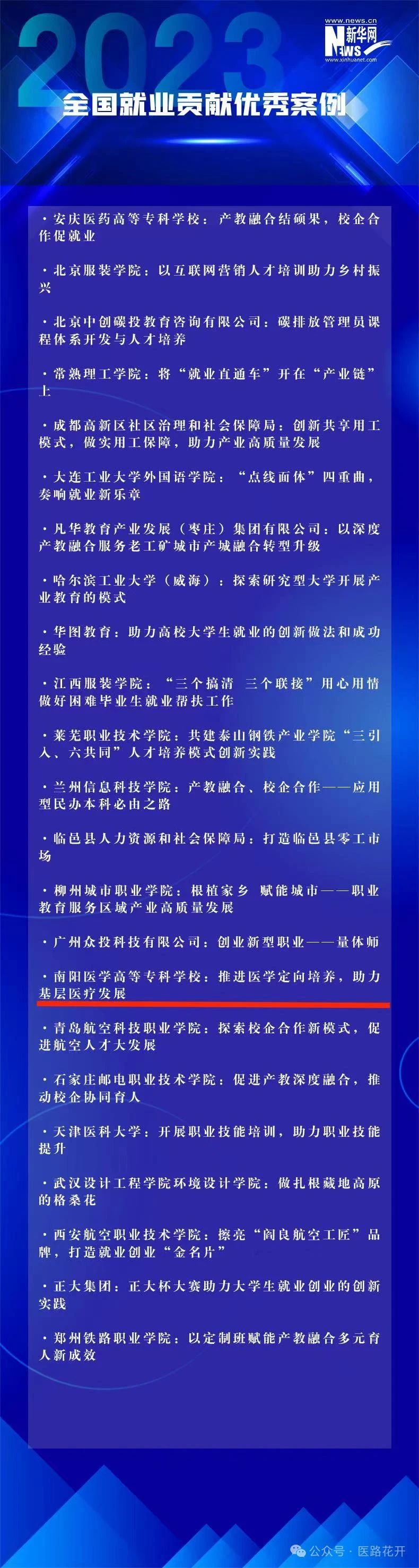 本网讯(文/就业创业处 张辉)近日,2023年全国就业贡献优秀案例征集结果公布,南阳医专临床医学系、就业创业处申报、推荐的“推进医学定向培养 助力基层医疗发展”就业工作案例榜上有名。据悉,本次案例评选全国各地各单位推荐材料近百件,经过收集整理、甄别筛选以及专家初评、复审,第一期活动遴选推出23个优秀案例。