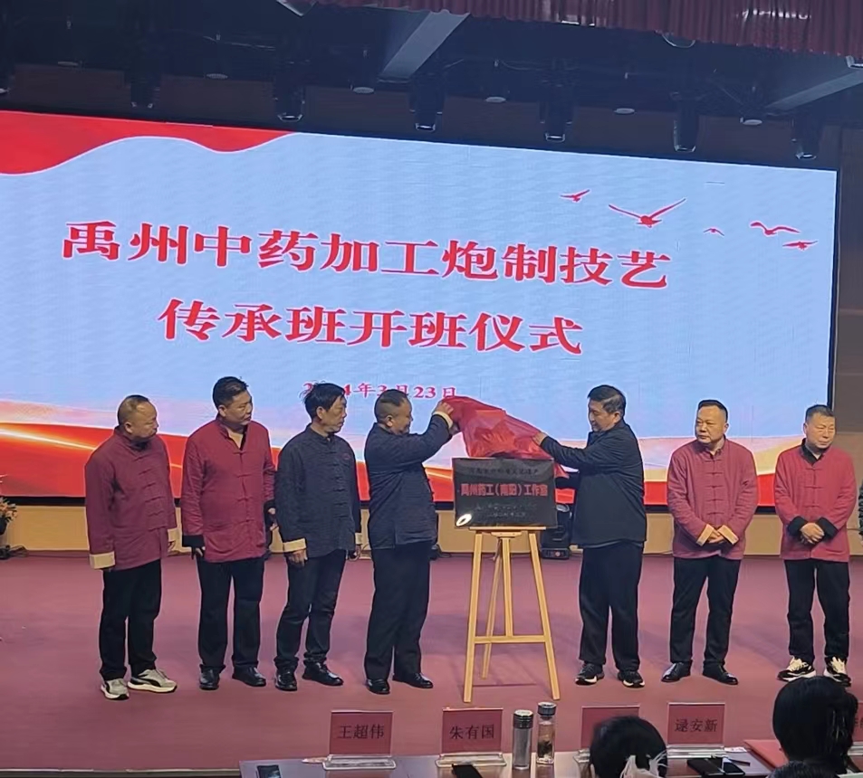 刘荣志为第一期开班授课的非遗传承导师逯安新、黄潇、李敏生、朱有国、许宗辉和王超伟六位大师颁发了非物质文化遗产传承导师聘书,杨明勋和逯安新共同为禹州药工(南阳)工作室揭牌。杨明勋鼓励学员们能够熟练掌握中药炮制技艺,成为非遗文化传承的中坚力量,希望学员们能够将所学知识和技能运用到实际工作中,为中医药事业的发展贡献自己的力量。