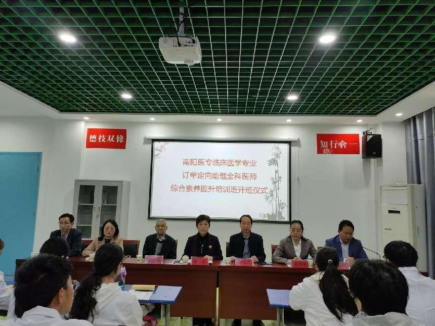 本网讯(文/临床医学系李林)4月8日上午,南阳医专临床医学专业订单定向助理全科医师第一期综合素养提升培训班开班仪式在实验楼一楼临床医学模拟中心举行。校长范真、副校长刘荣志、“胡氏捻筋法”第三代传人胡胜军出席,中医系主任张明丽,医学技术系主任李玲,临床医学系党总支书记宗山林、副主任周毕军、授课教师代表以及第一期订单定向班全体学员参加开班仪式。开班仪式由副校长刘荣志主持。