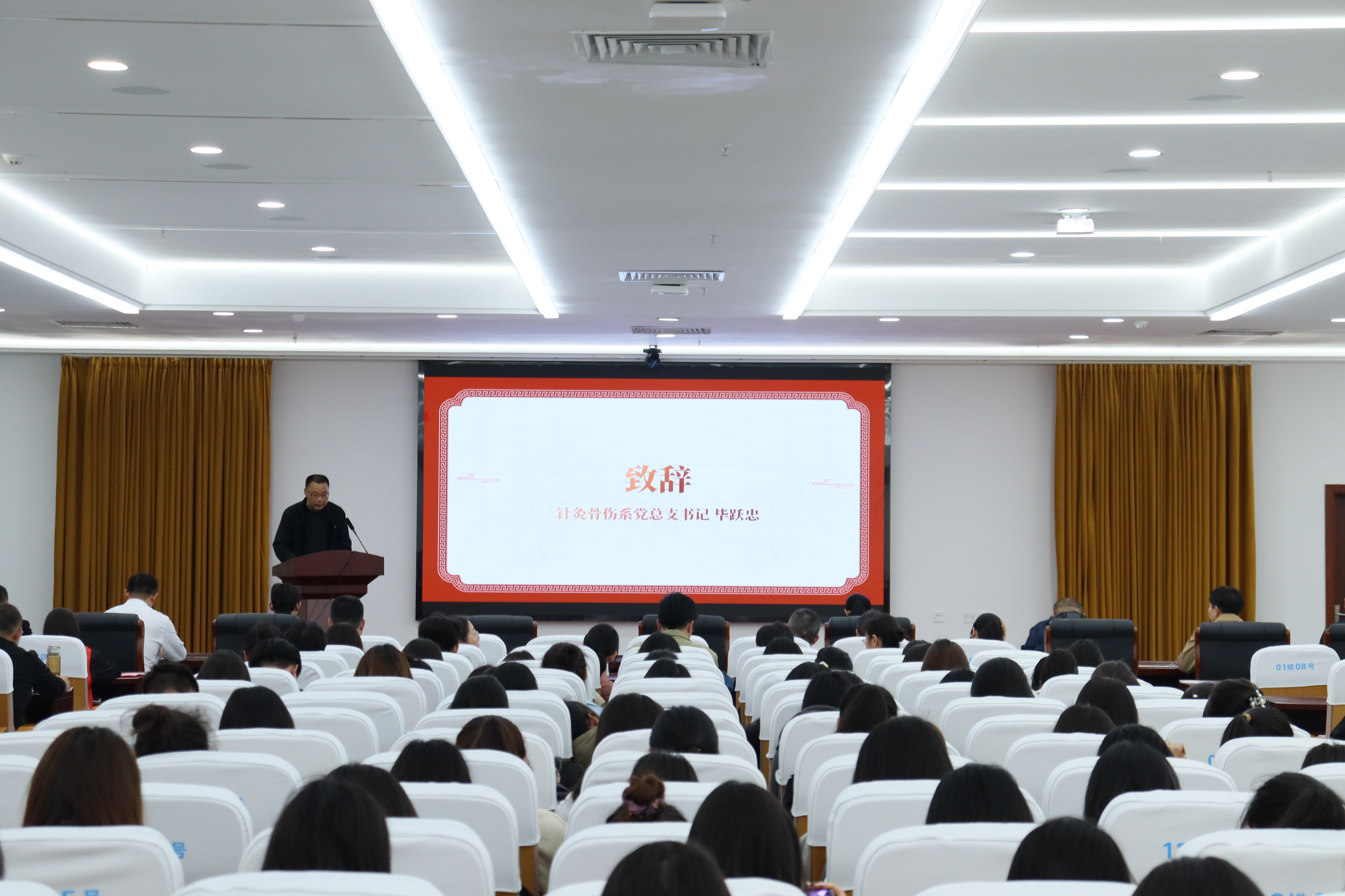 毕跃忠致辞,他介绍了本次活动的主要内容,强调了活动意义,对针灸骨伤系学科专业建设工作提出了具体要求。