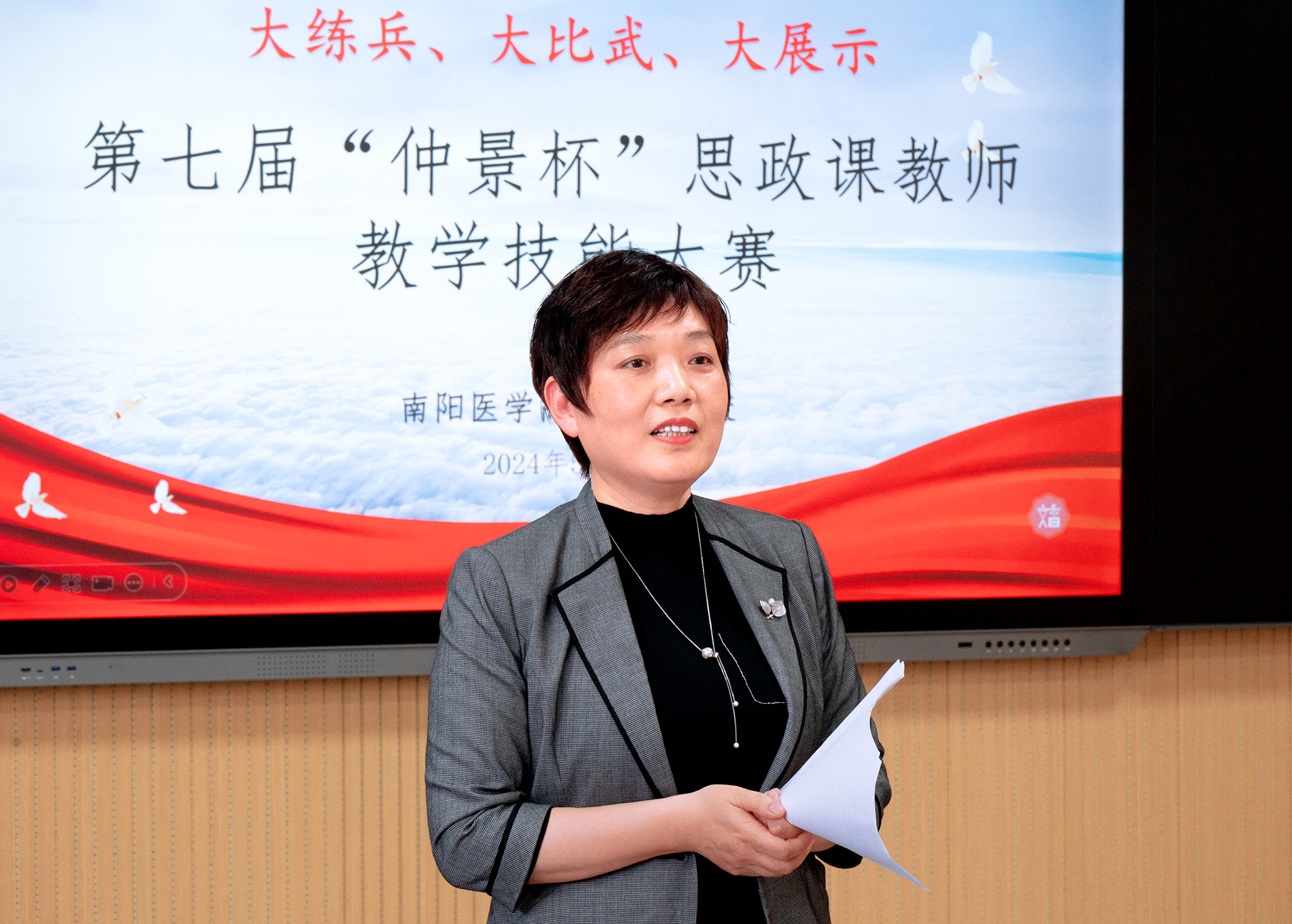 校长范真在致辞中指出,思政课是高校教育的核心,承载着“立德树人”“铸魂育人”的神圣使命。本次大赛是学习宣传贯彻党的二十大精神,推动习近平新时代中国特色社会主义思想“三进”工作的重要举措,也是校党委“1233”工作的重要内容,是“铸魂育人”工程的重要部分,体现了校党委、行政对思政课建设的高度重视。我校连续七年举办“仲景杯”思政课教师教学技能大赛,通过大赛,教师们的教学内容更加充实,现代教学手段运用更加娴熟,思政课教学质量进一步提高,达到了“启智润心”的教育效果。她希望各位教师要把本次比赛作为新的起点,持续提高授课水平,使党的创新理论真正进课堂,达到入耳入脑入心的教学效果。