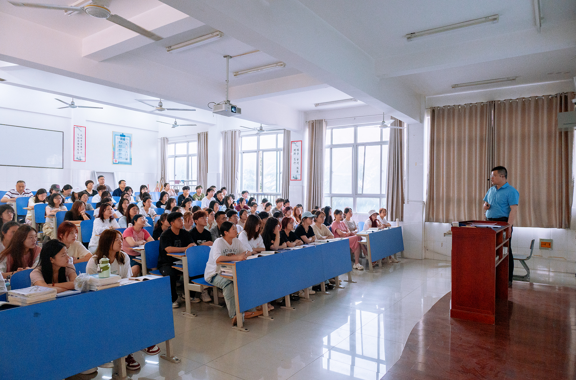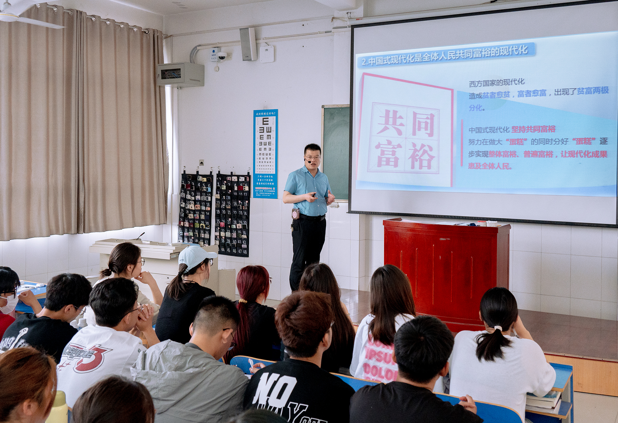 刘涛以方志敏烈士《可爱的中国》开讲,从“读懂中国式现代化的中国特色、推进中国式现代化行稳致远、新时代新征程青年的使命担当”三个方面进行了深入浅出的讲解,既有整体解读也有重点阐释。课程结合当前国际国内形势,通过典型案例,从历史和现实等多层面引导学生理解“如何读懂中国式现代化的中国特色”和“怎样承担新时代青年的责任使命”这些重要课题。课堂上观看了习近平总书记与大学生在一起的温暖瞬间,重温了习近平总书记对大学生们的殷切寄语:“不负韶华,不负时代,不负人民,在青春的赛道上奋力奔跑,争取跑出当代青年的最好成绩”。最后,他还结合我校优秀毕业生范浩源、史双奎的先进事迹,鼓励同学们既要怀抱梦想又要脚踏实地,既要敢想敢为又要善作善成,立志做有理想、敢担当、能吃苦、肯奋斗的新时代好青年,让青春在推进中国式现代化的火热实践中绽放绚丽之花。