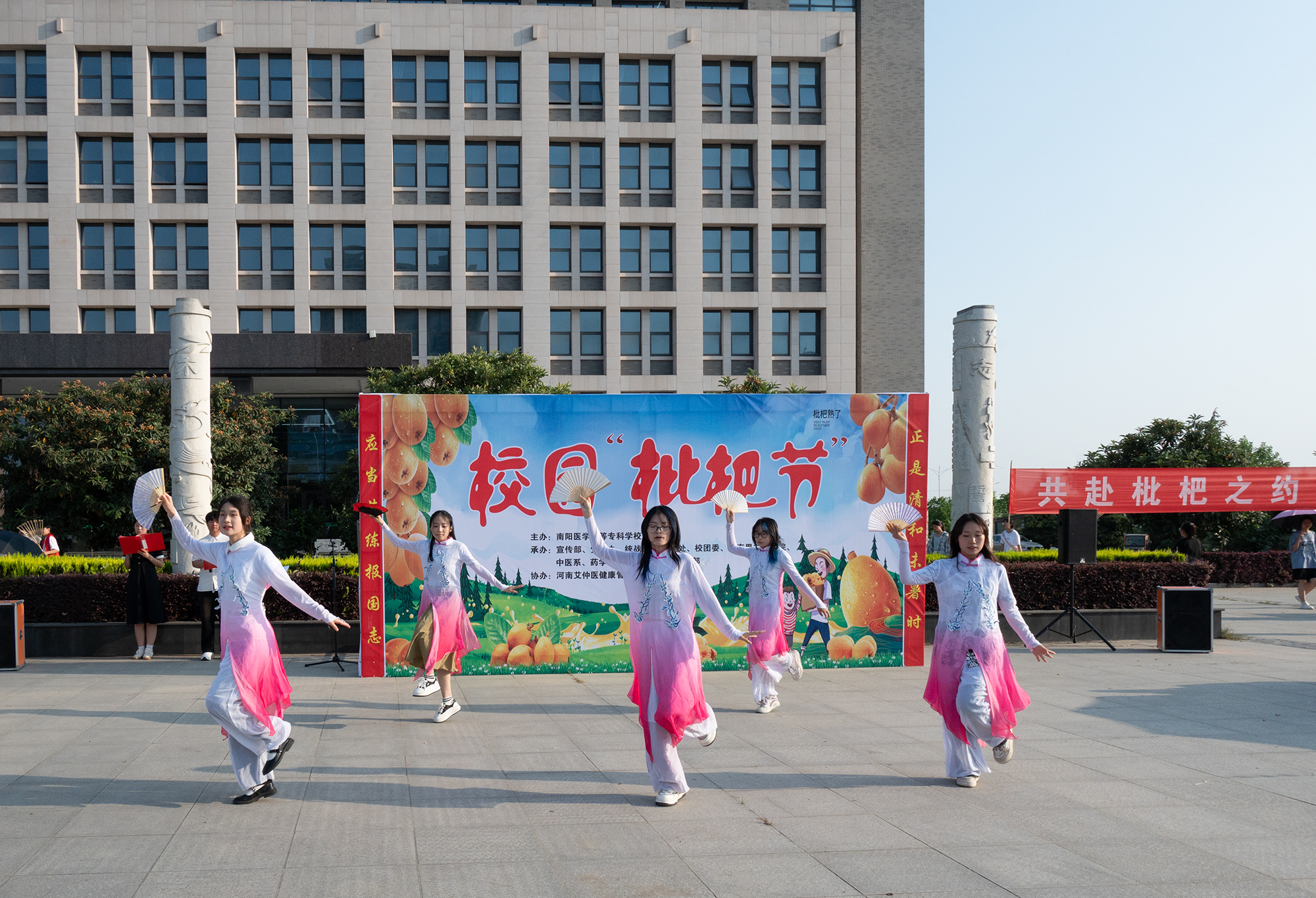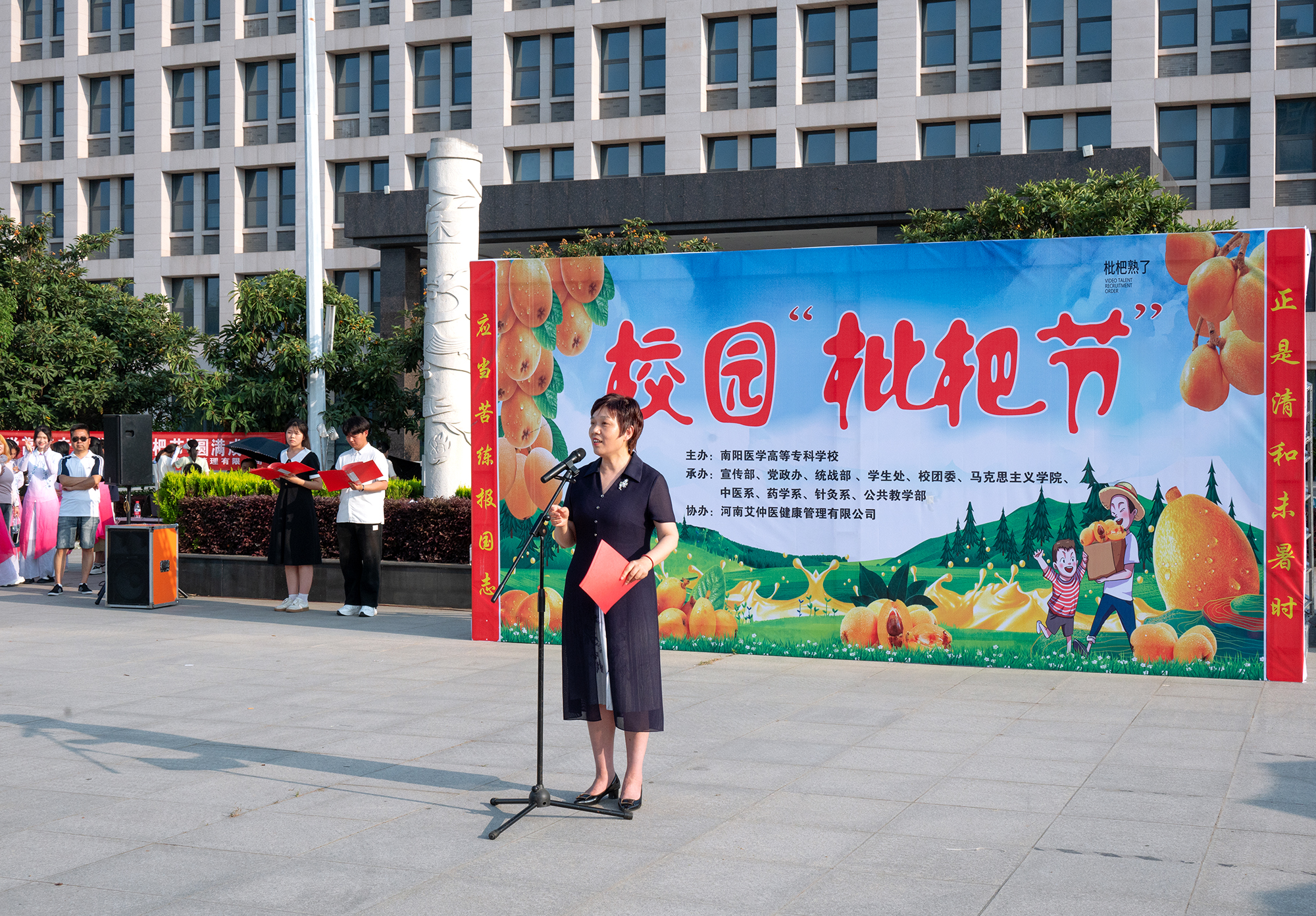 本网讯(文/中医系 刘元)五月枇杷满枝香,5月22日下午,我校“枇杷节”活动在仲景东区日晷广场成功举行。校长范真、副校长秦玖刚出席活动,党政办、宣传部、统战部、学生处、团委、马克思主义学院、公共教学部、中医系、药学系、针灸骨伤系负责同志和师生代表参加活动。