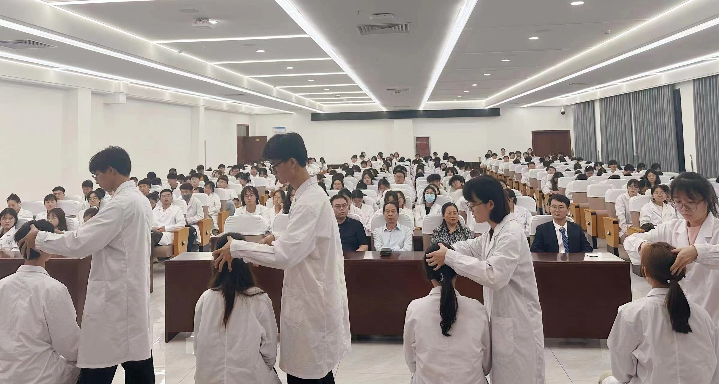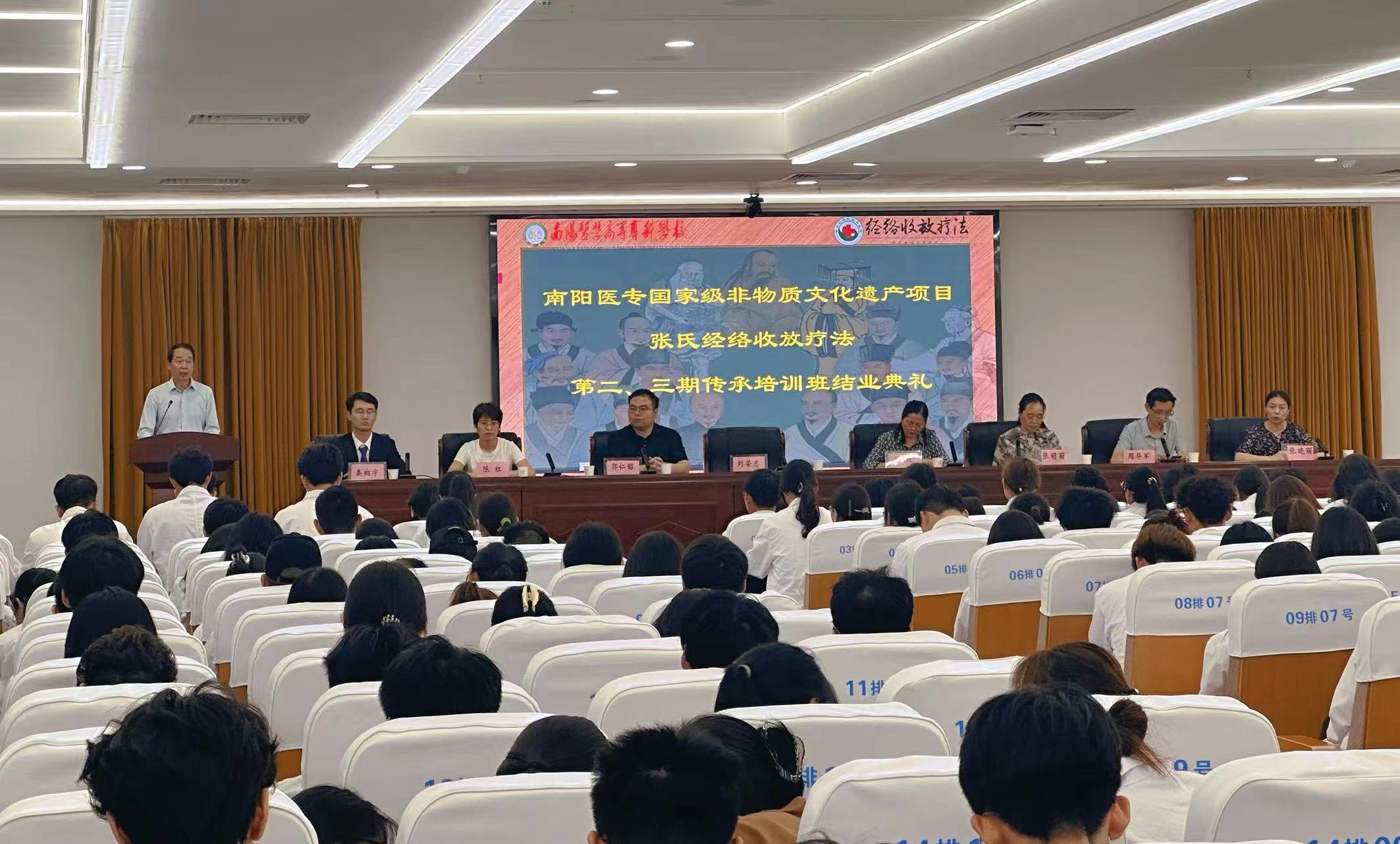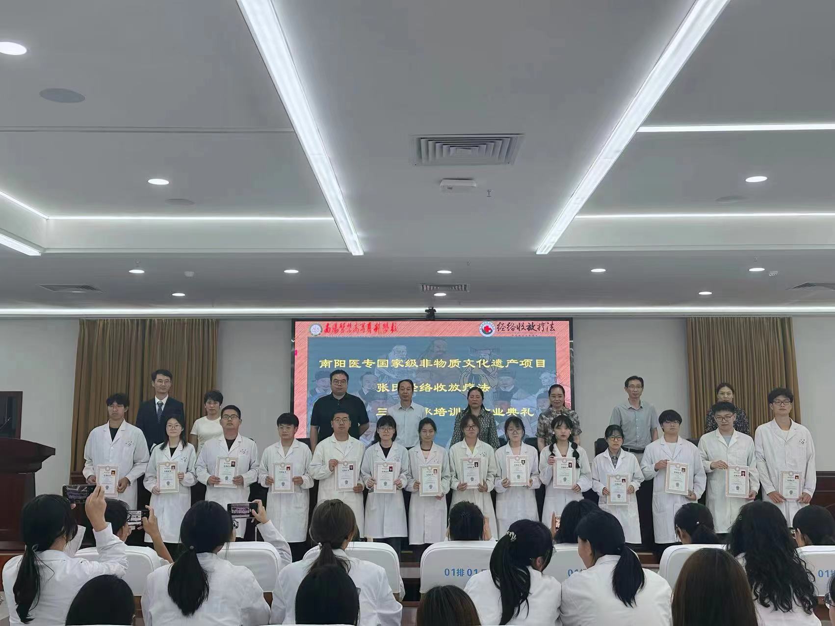 本网讯(文/中医系王翘楚)5月25日,国家级非遗项目张氏经络收放疗法第二、三期传承班结业典礼暨技艺展演活动在仲景文化中心719会议室举行。副校长刘荣志,康复系、临床系、中医系、经络收放疗法传承人郭仁昭老师及300余名学员参加典礼。典礼由中医系主任张明丽主持。