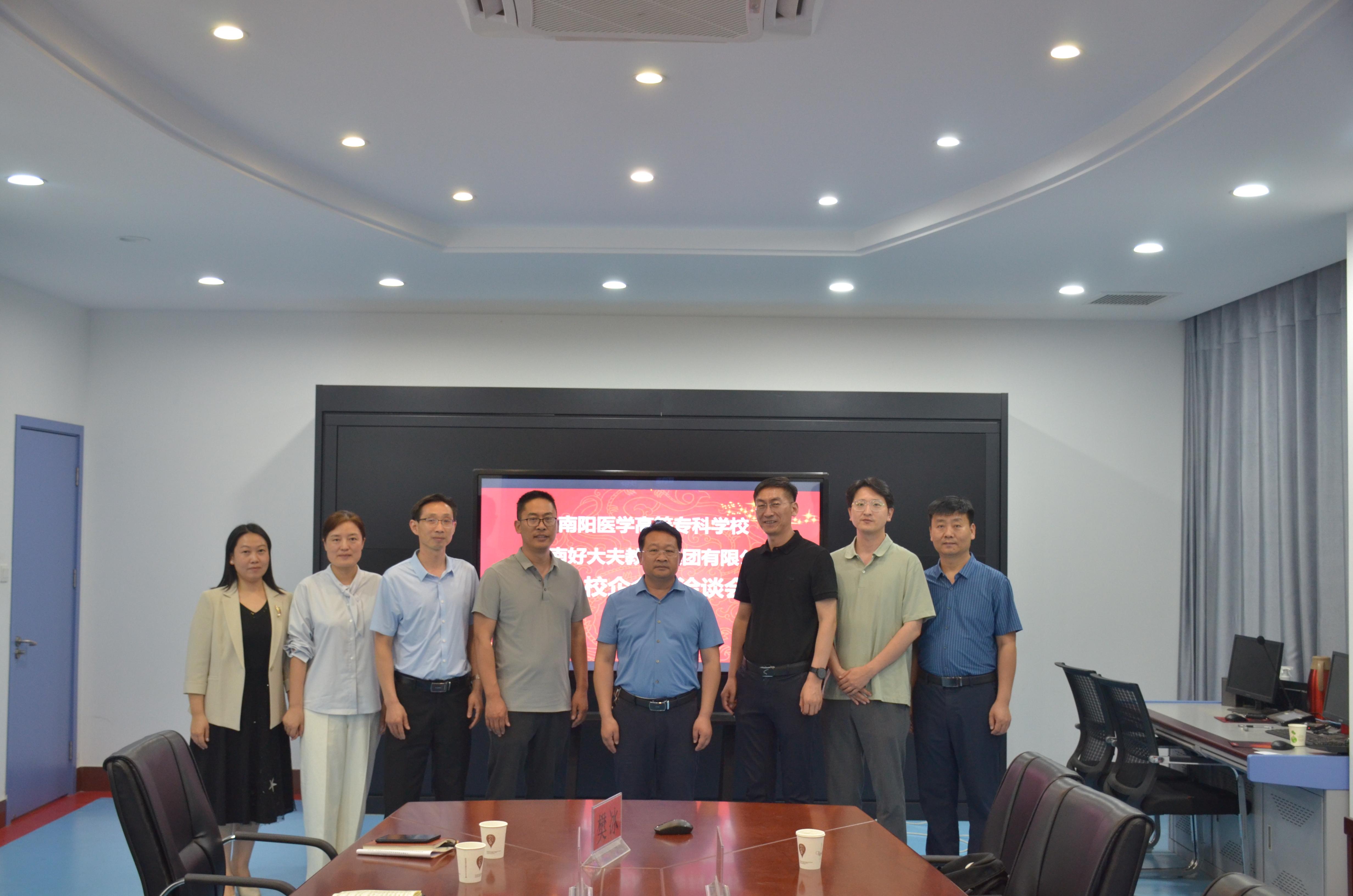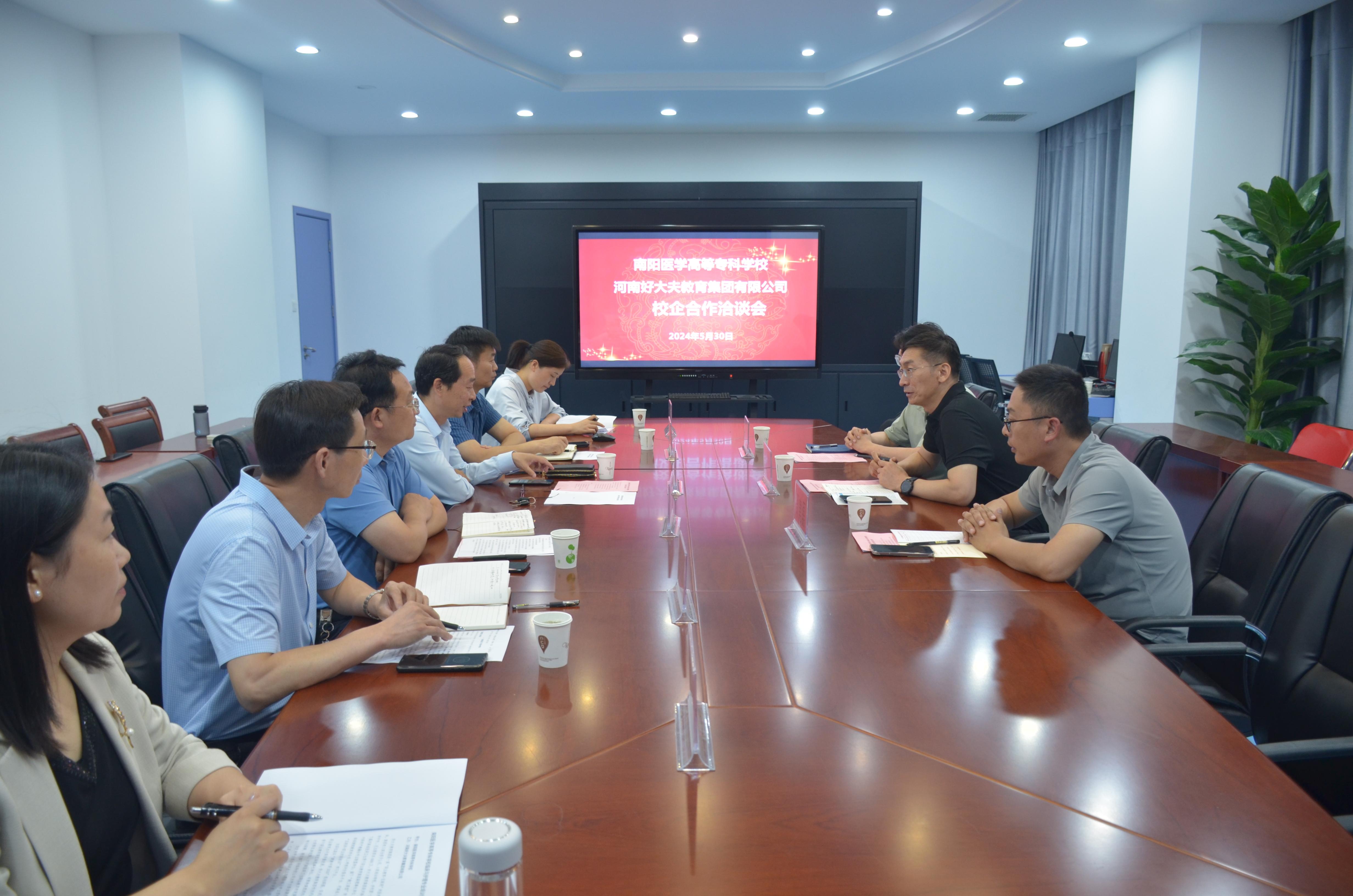 本网讯(文/临床系 侯萍)为进一步促进校企合作,深化产教融合,提升人才培养质量,5月30日下午,河南好大夫教育集团有限公司董事长赵冰、河南中卫健科网络科技有限公司总经理周建磊、技术总监张瀚一一行到我校临床医学系进行洽谈交流。副校长刘荣志,教务处教学科科长樊冰及临床医学系相关负责人参会。会议由临床医学系党总支书记宗山林主持。