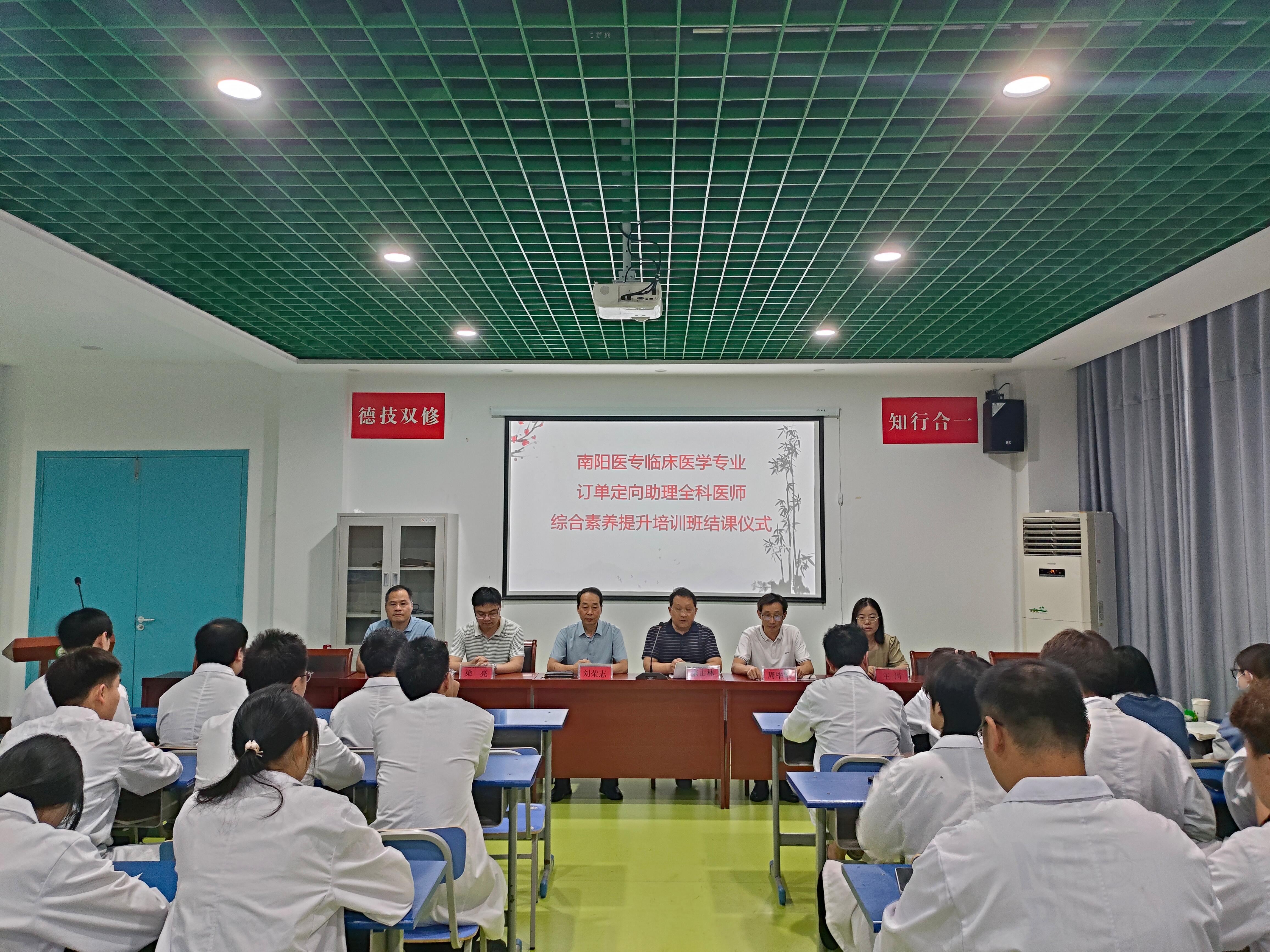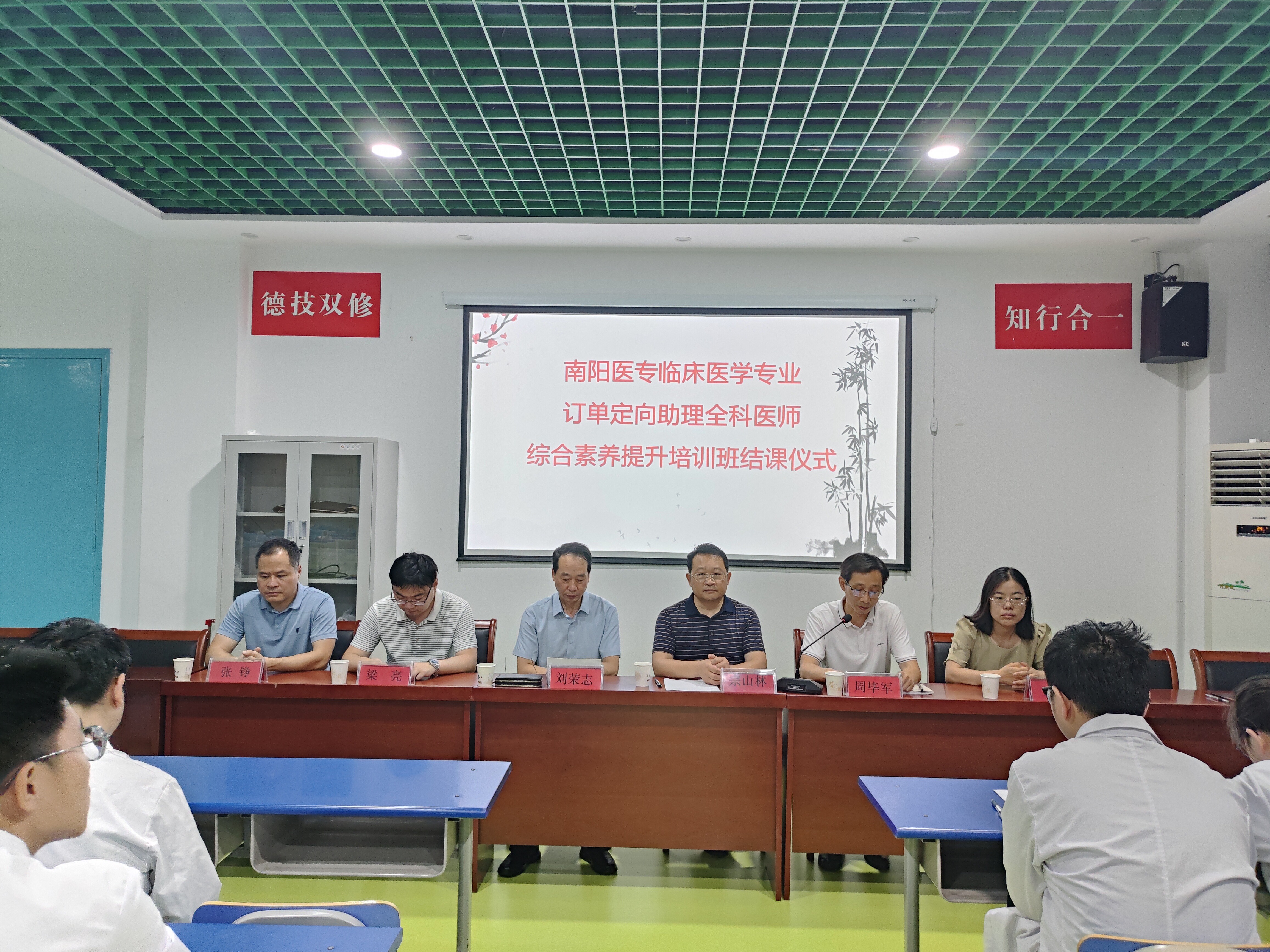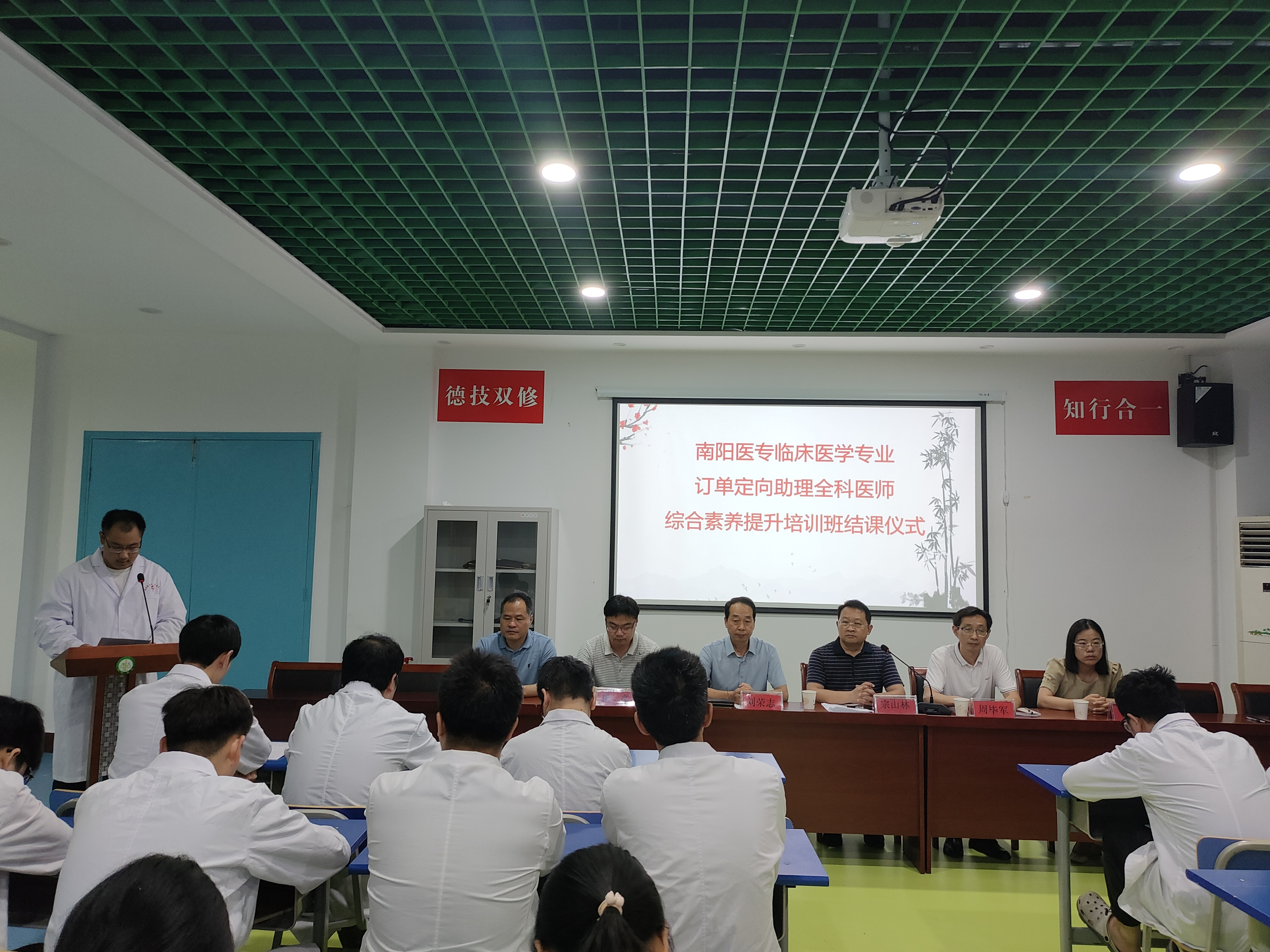 本网讯(文/临床系李雨鹤)6月21日上午,南阳医专临床医学专业订单定向助理全科医师第一期综合素养提升培训班的课程圆满完成,结课仪式在实验楼一楼临床医学模拟中心举行。副校长刘荣志,教务处副处长梁亮,临床医学系领导班子成员以及第一期订单定向班全体学员参加结课仪式。结课仪式由临床医学系党总支书记宗山林主持。