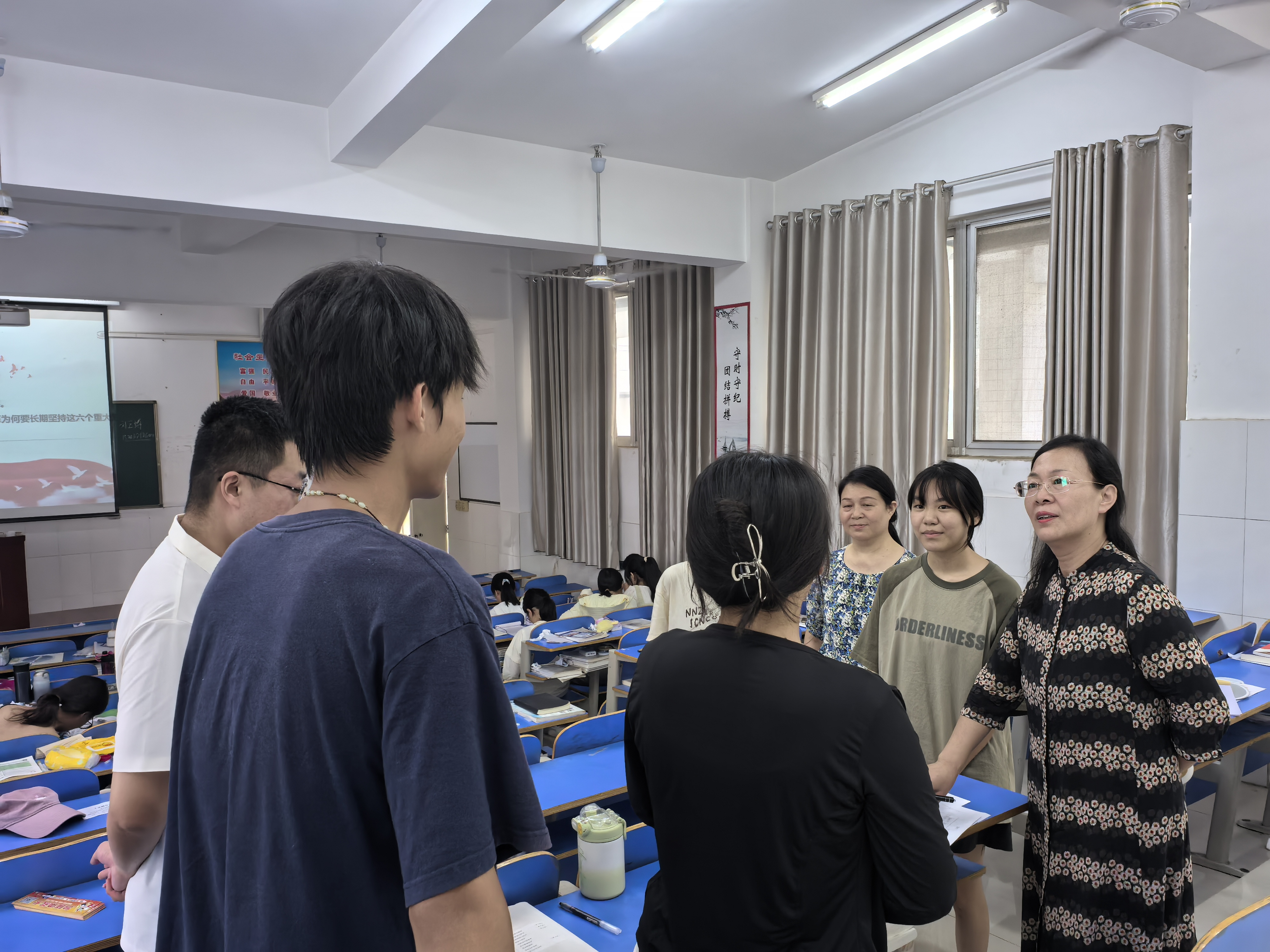 课后,杜晓平了解同学们对教师授课情况认识和评价。杜晓平对刘玉博、陈萌、庞丽三位年轻教师教态、授课内容给予充分肯定,在教学方法提出了意见和建议,指导教师在增进对党的创新理论的政治认同、思想认同、理论认同、情感认同,坚定“四个自信”,启发学生思考、引导师生互动方面下功夫,提升课堂教学效果。杜晓平勉励教师们认真学习领会《教育部办公厅关于开展2024年——2025学年高校思政课教学提升行动的通知》精神,加强集体备课,深入了解学生思想动态,有效解疑释惑,积极对学生进行价值引领。(编审李峰松)