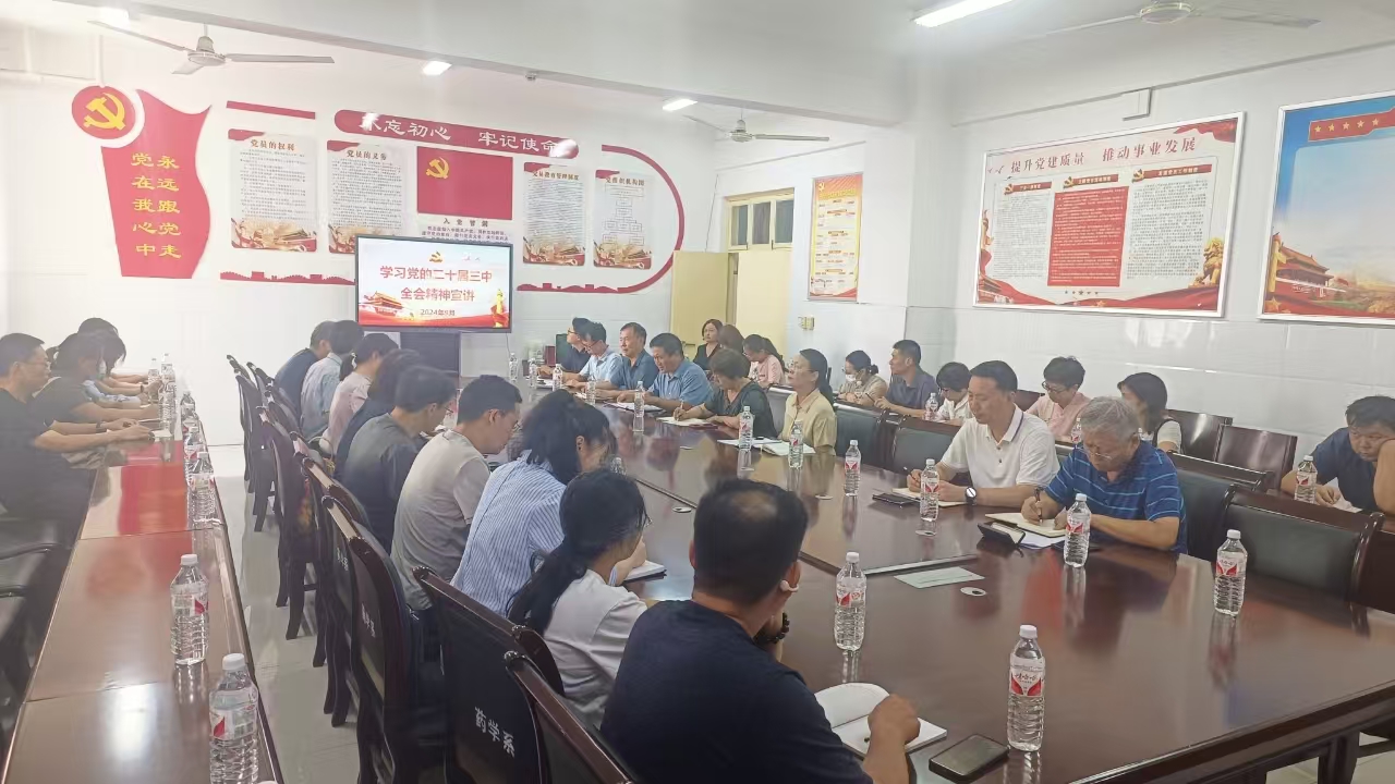 本网讯(文/药学系赵伊娜)9月11日下午,校党委委员、工会主席杜晓平深入药学系主持召开专题会议,宣讲党的二十届三中全会精神。马克思主义学院、工会、团委、离退处、药学系和仲景文化研究院等科级以上干部及师生代表参加会议。