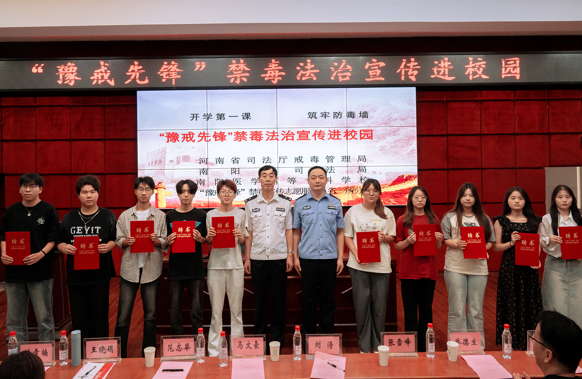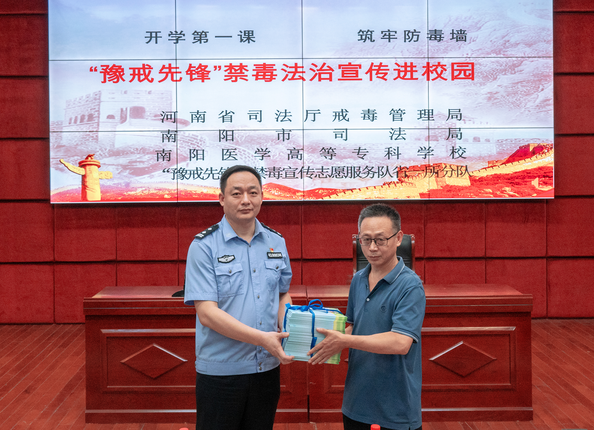 省司法厅戒毒管理局副局长马文豪、省第一强制隔离戒毒所副所长范志举向我校赠送了青少年禁毒宣传教育读本,并向我校的10名校园禁毒宣传志愿者颁发聘书。(编审/李峰松摄影/胡磊)