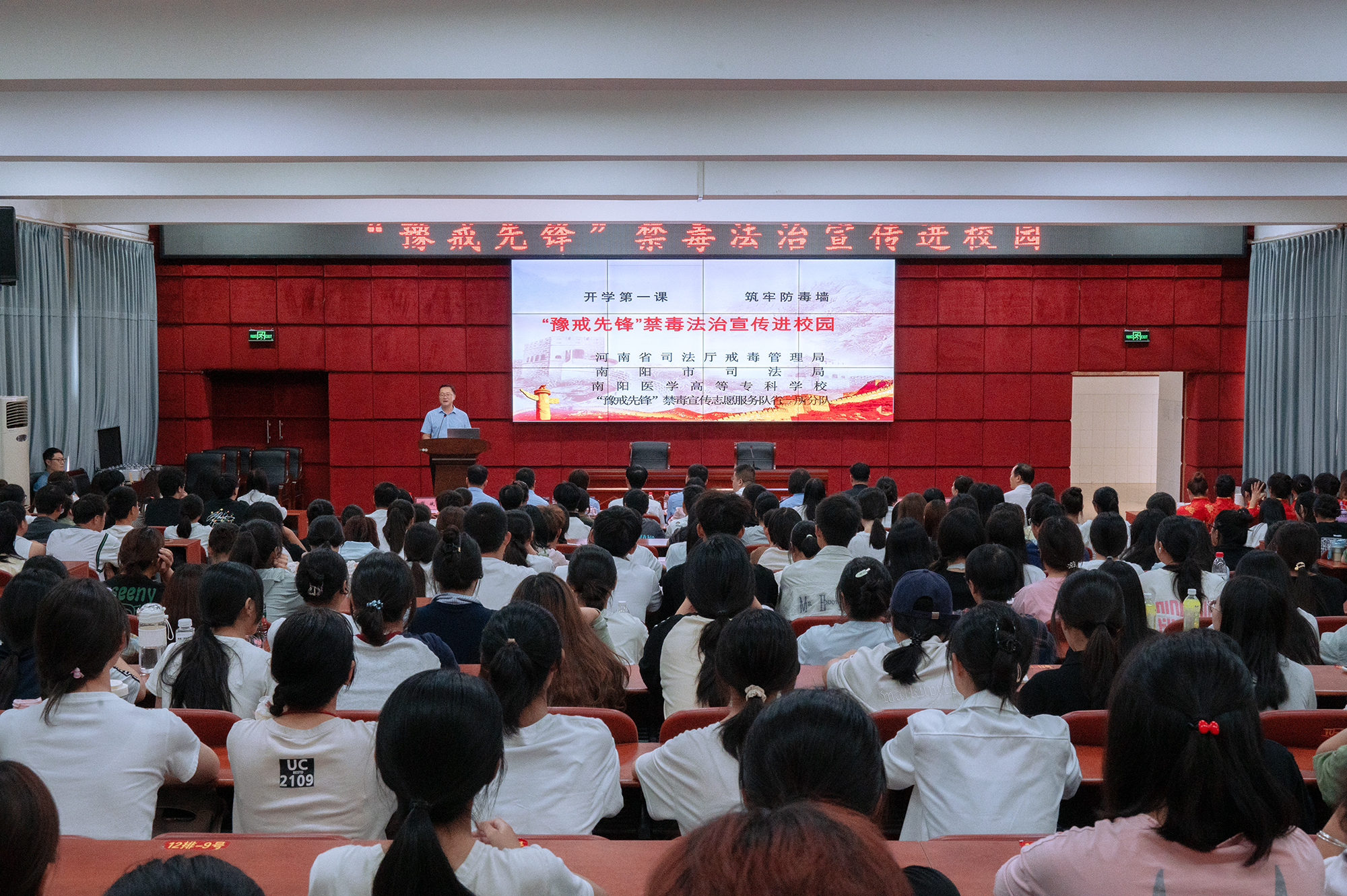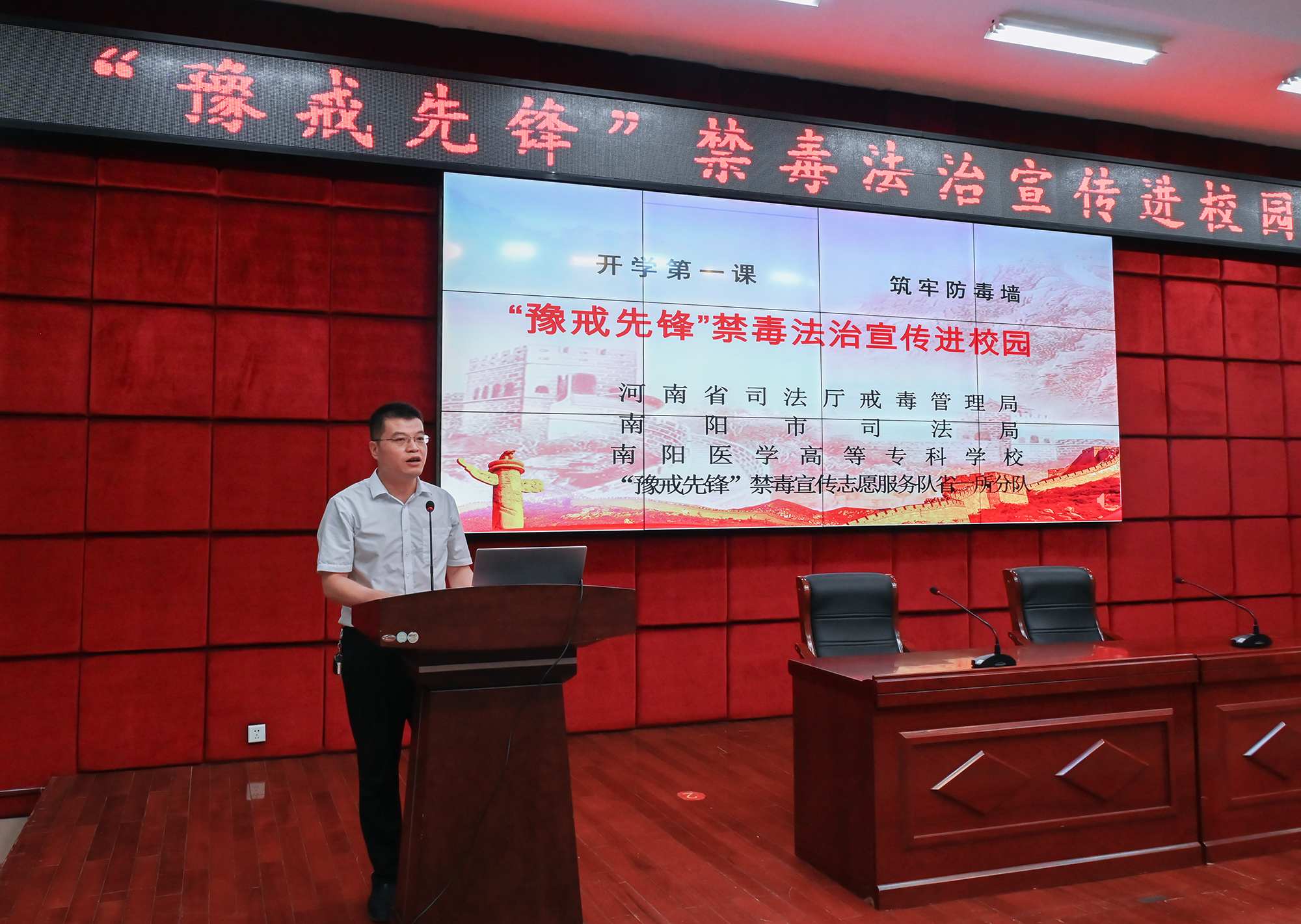 本网讯(文/法制办刘一凡)为深入贯彻实施《中华人民共和国禁毒法》,提高广大师生的禁毒意识,在全体师生中倡导“拒绝毒品,关爱生命”的理念,提高大学生识毒、防毒、拒毒的意识和能力,9月19日,南阳医专邀请“豫戒先锋”禁毒宣传志愿服务队省一所分队走进我校,为广大师生开展禁毒宣传教育活动。南阳医专党委副书记刘涛出席活动并致欢迎辞。