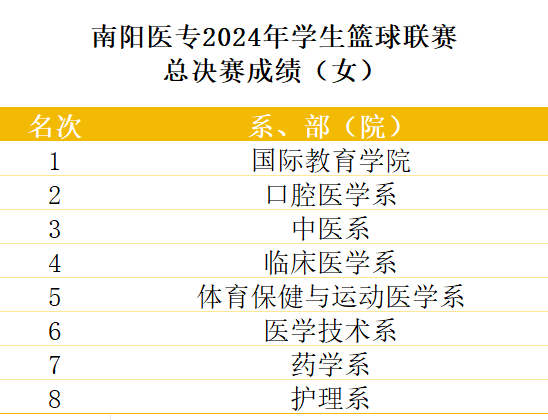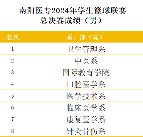 本届比赛由学校体育运动委员会办公室(体育保健与运动医学系)承办,各涉学系(部、院)协办。于10月16日至11月1日,历经17天55场激烈角逐,卫生管理系、国际教育学院分别摘得男、女子桂冠;获得男子前八名的还有:中医系、国际教育学院、口腔医学系、医学技术系、临床医学系、康复医学系、针灸骨伤系;获得女子前八名的还有:口腔医学系、中医系、临床医学系、体育保健与运动医学系、医学技术系、药学系、护理系。