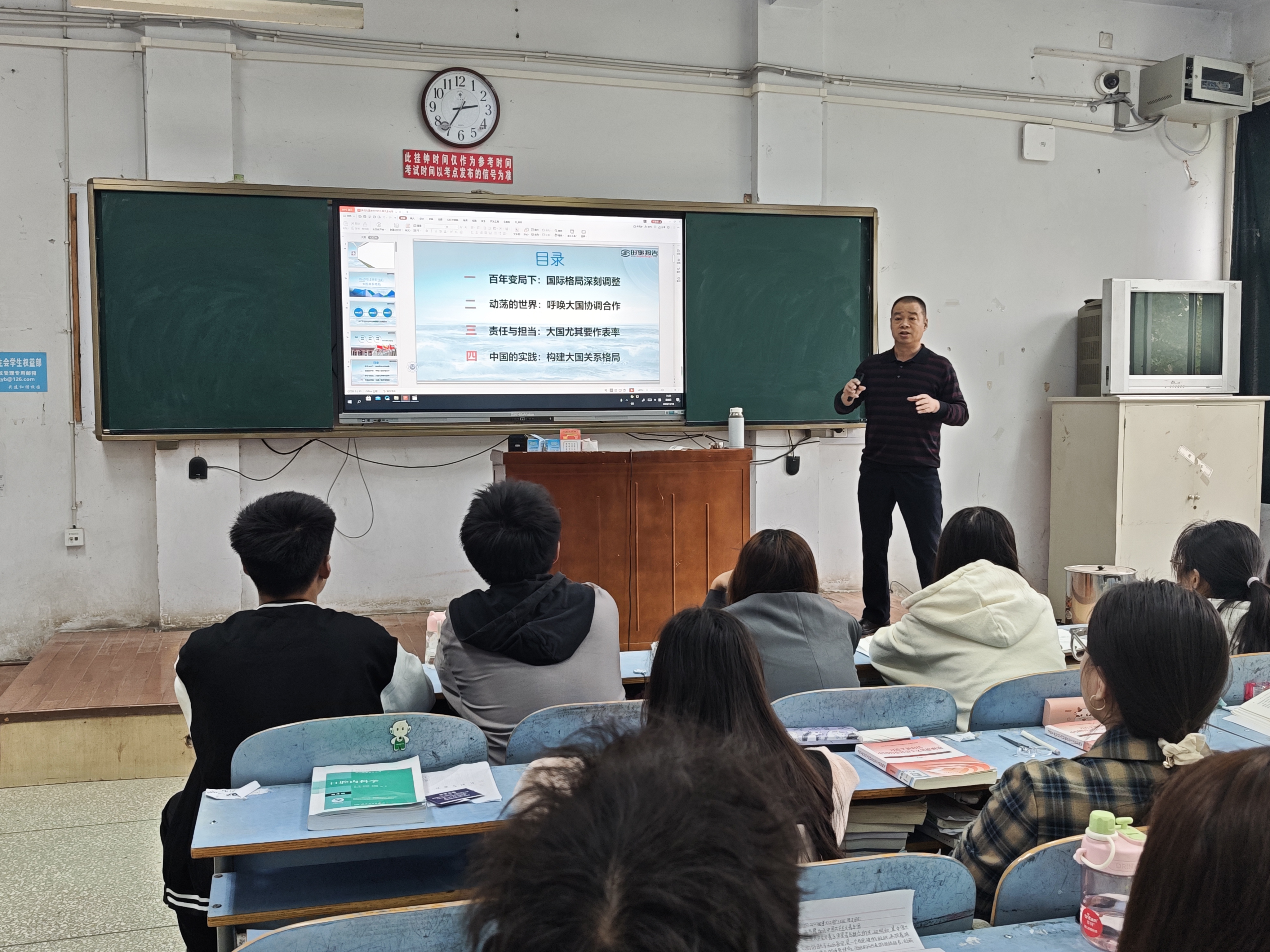 秦玖刚以《推动构建新时代的大国关系格局》为题,结合当前国际形势的发展变化,从“百年变局下:国际格局深刻调整;动荡的世界:呼唤大国协调合作;责任与担当:大国尤其要作表率;中国的实践:构建大国关系格局”四个方面进行了详细解读,深入浅出地剖析了当前国际形势的复杂性,以及中国在处理大国关系中的原则立场和实际行动。他说,当今世界正面临百年未有之大变局,国际格局深刻调整,动荡的世界呼唤大国协调合作。作为负责任的大国,中国始终秉持和平、合作、共赢的外交政策,致力于推动构建人类命运共同体。最后,他鼓励新时代青年学子要积极培养国际视野和人文关怀,锻炼敏锐的洞察力、判断力和行动力。要将个人成长成才的理想与祖国发展的目标紧密相连,将小我融入大我,服务强国建设,实现中华民族伟大复兴的中国梦。