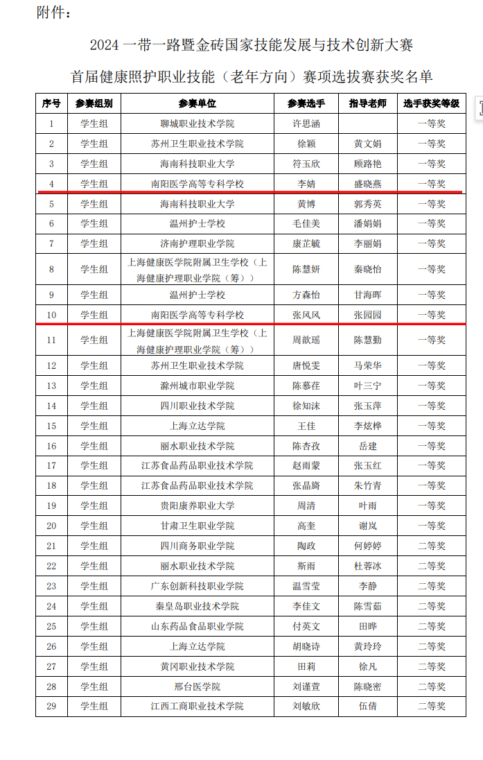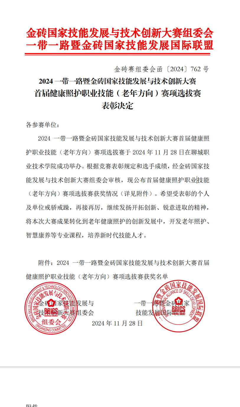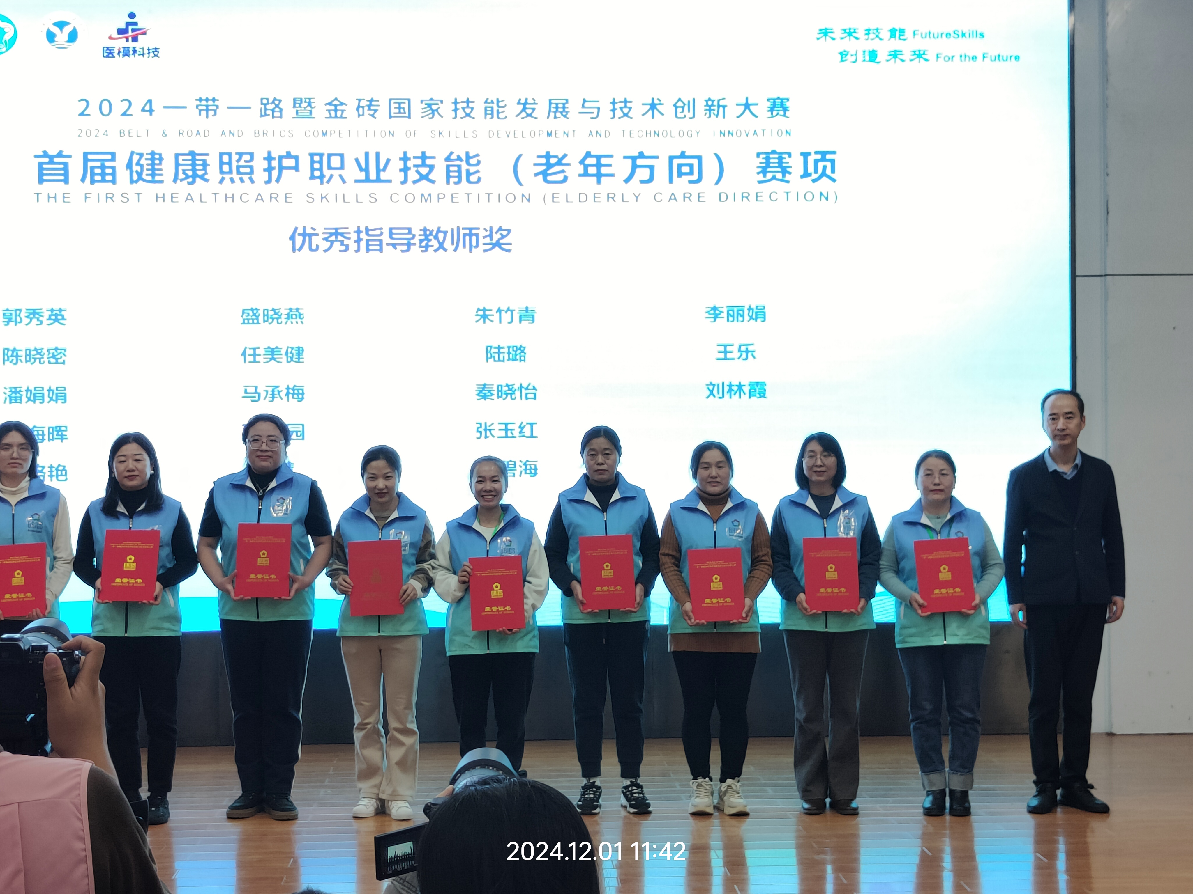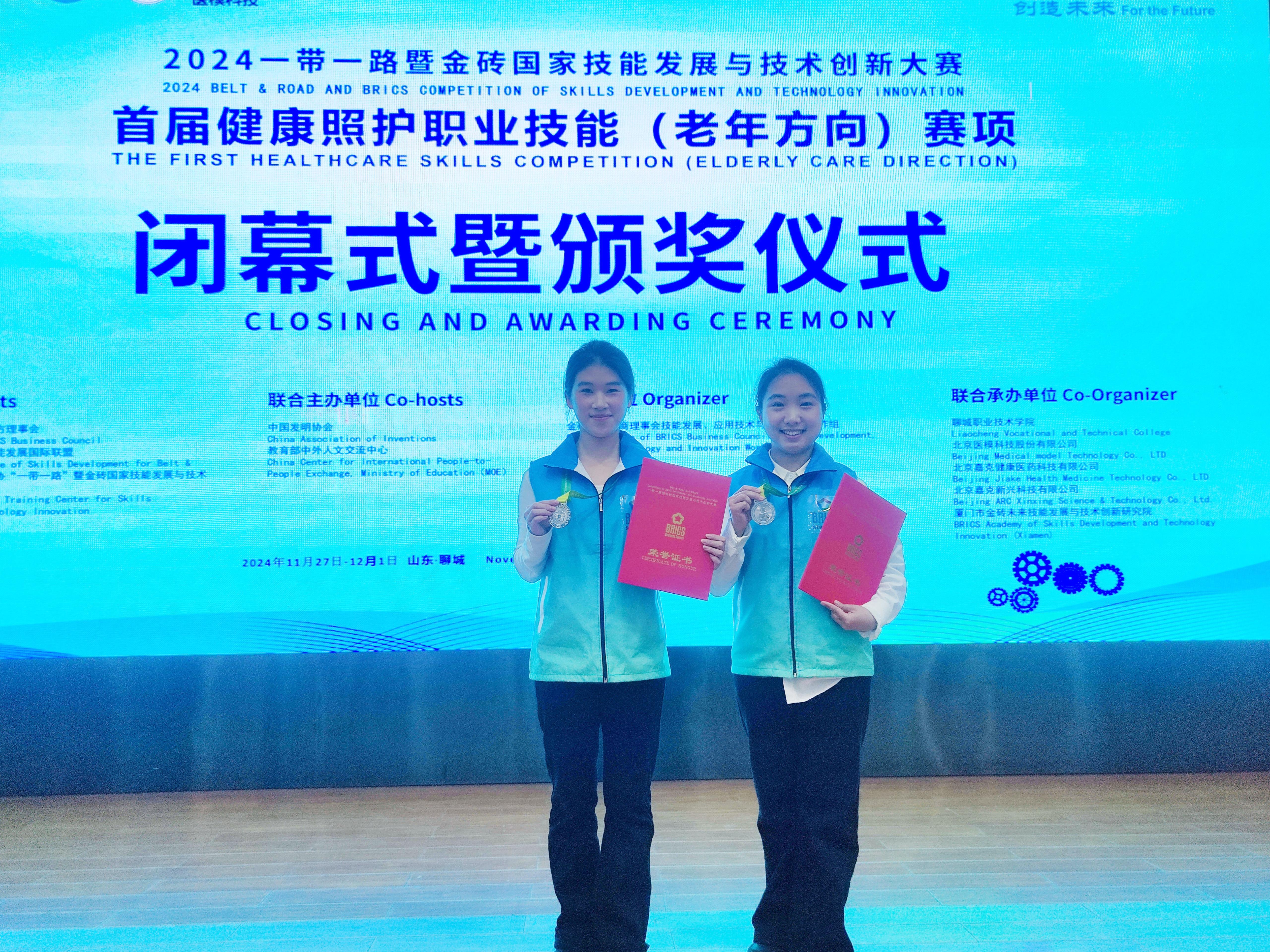 本网讯(文/护理系 何红丽)11月28日至30日,2024年“一带一路”暨金砖国家技能发展与技术创新大赛之首届健康照护职业技能(老年方向)竞赛全国总决赛在聊城职业技术学院举行。在全国总决赛中,我校护理系李婧、张风风分别以第7名和第10名的成绩荣获“国内总决赛二等奖(银牌)”,教师盛晓燕、张园园荣获“优秀指导教师奖”,我校获得“优秀组织奖”。