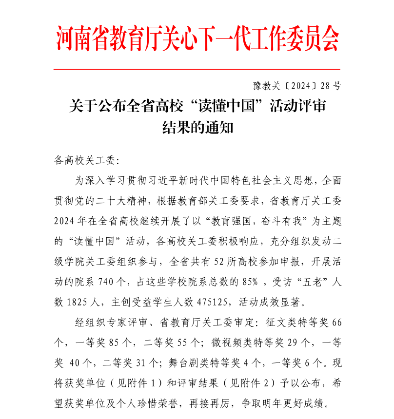 本网讯(文/离退处朱迪)近日,2024年度全省高校“读懂中国”评审结果揭晓,我校关工委被评为高职高专组获奖单位,获得微视频组特等奖1项,征文组一等奖2项。