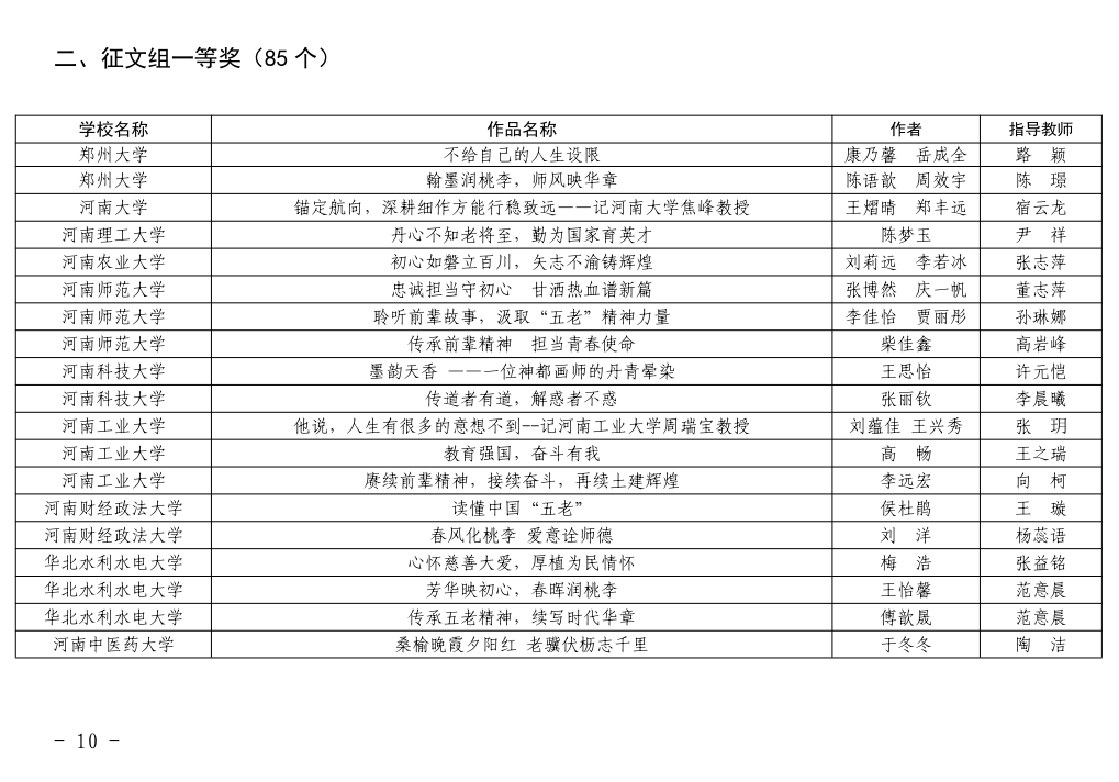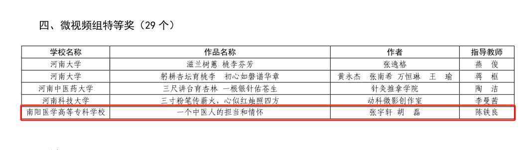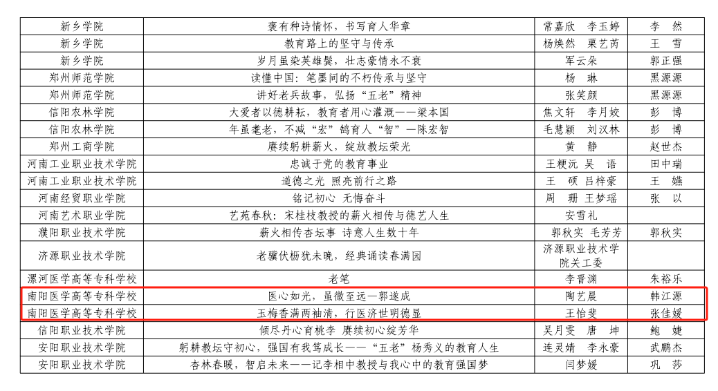为深入学习贯彻习近平新时代中国特色社会主义思想,全面贯彻党的二十大精神,根据教育部关工委要求,省教育厅关工委2024年在全省高校继续开展了以“教育强国,奋斗有我”为主题的“读懂中国”活动。我校关工委积极组织相关活动,下发了《南阳医专关工委开展2024年“读懂中国”活动的实施方案》,学校各二级关工委认真组织,积极参与,活动成效显著。最后由我校关工委报送的征文《医心如光,虽微至远——郭遂成》、《玉梅香满两袖清,行医济世明德显》获得征文组一等奖,微视频《一个中医人的担当和情怀》获得微视频组特等奖。我校关工委将倍加珍惜荣誉,再接再厉,争取更好成绩。(编审李峰松)
