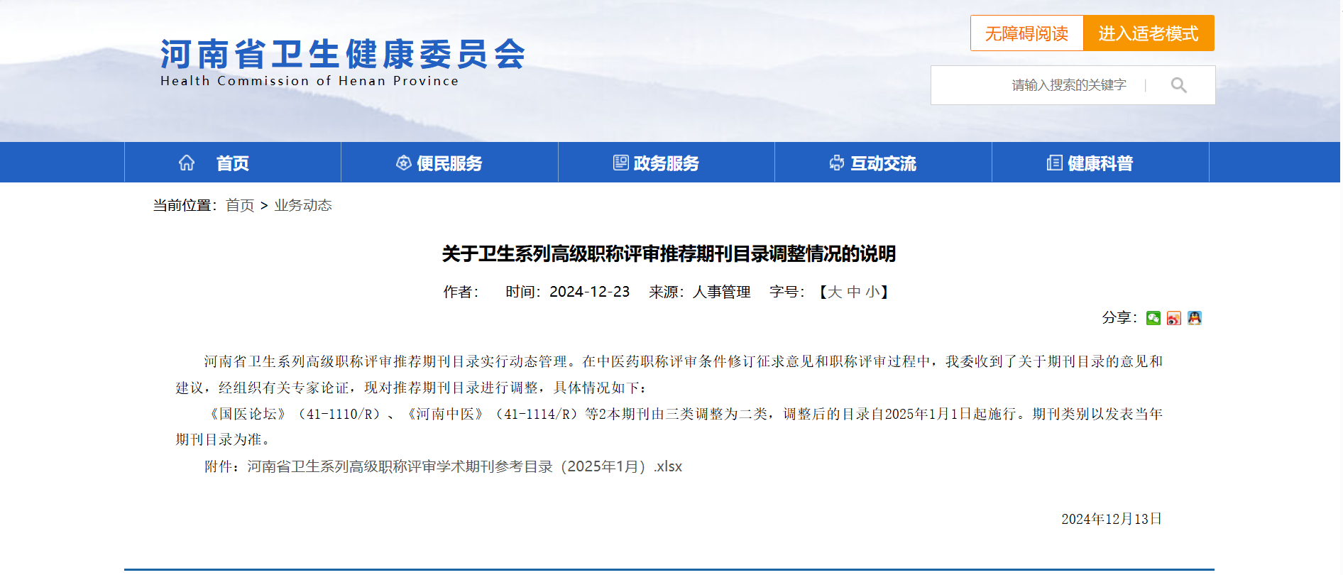 本网讯(文/国医论坛编辑部 魏怡晨)根据河南省卫生健康委员会发布的《关于卫生系列高级职称评审推荐期刊目录调整情况的说明》,《国医论坛》杂志自2025年1月1日起晋升为河南省卫生系列高级职称评审二类学术期刊。此次调整也标志着《国医论坛》杂志的学术质量和影响力有了质的提升。《国医论坛》杂志创刊于1986年,现由中华中医药学会、南阳医学高等专科学校主办,河南省中医药管理局主管。2011年被评为河南省自然科学一级期刊。杂志被中国知网、万方数据、重庆维普、长江文库等多家国内知名数据库和文摘杂志收录,成为这些数据库和文摘的统计源期刊。《国医论坛》杂志入选AMI职院刊扩展版(2022版)。