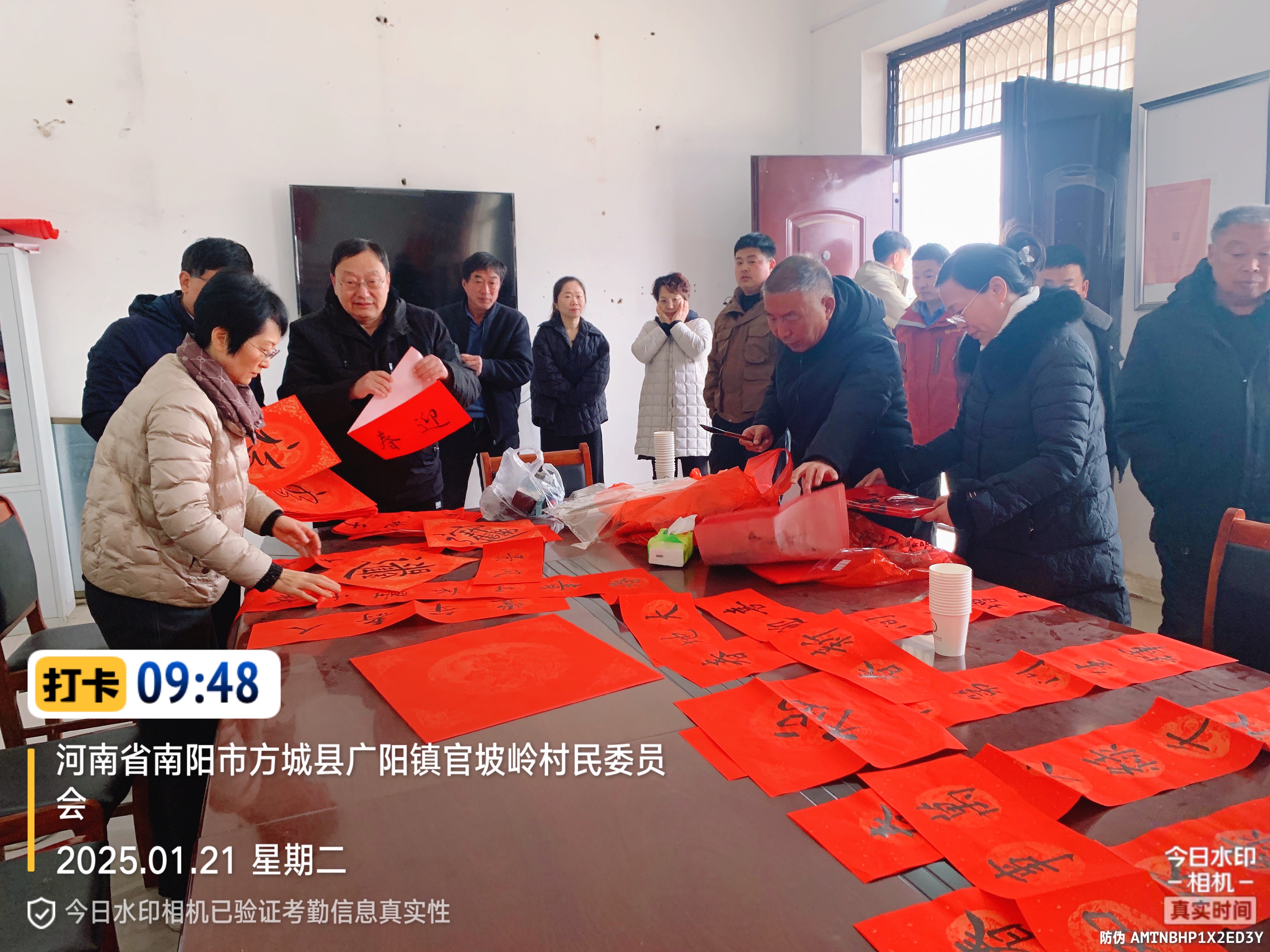 本网讯(文/校工会 程小果)金龙辞旧岁,银蛇贺新春。新春佳节至,为弘扬中华传统文化,丰富基层群众文化生活,营造吉祥如意、喜乐安宁的春节氛围,2025年1月20日,南阳医专党委委员、工会主席杜晓平带领工会、帮扶责任人来到方城县广阳镇官坡岭村,开展“乡村振兴 春联送福”活动,为帮扶村民义务写春联、送春联,喜迎佳节,共庆新春。