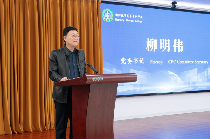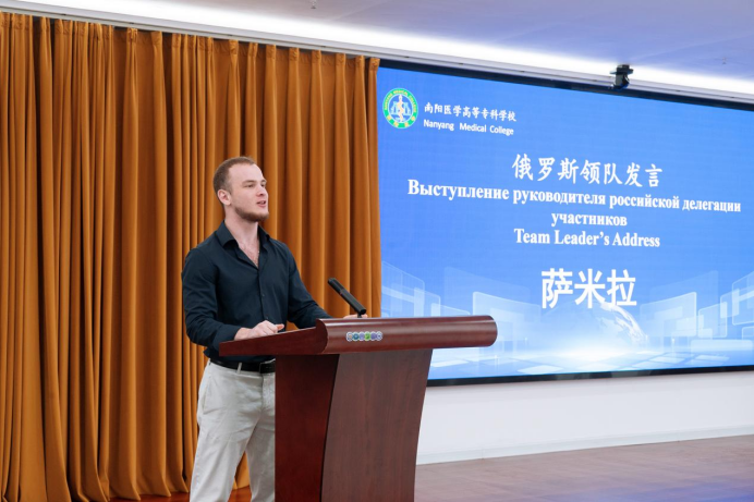 柳明伟祝贺学员们顺利结业,为学员颁发了结业证书。他在讲话中肯定了学员们的求知热情和乐学好学的精神,他指出,南阳医专以传承和弘扬仲景文化为己任,以国际化视野推动中医药文化传承创新发展,成功探索出一条独具特色的“职教出海”之路。本次培训根据学员需求,结合学校中医药优质教育资源,倾心打造了中医适宜技术系统培训课程。希望俄罗斯学员回国后能够成为在俄传播中医文化的使者和连接中俄交流的桥梁,祝愿中俄友谊长存。