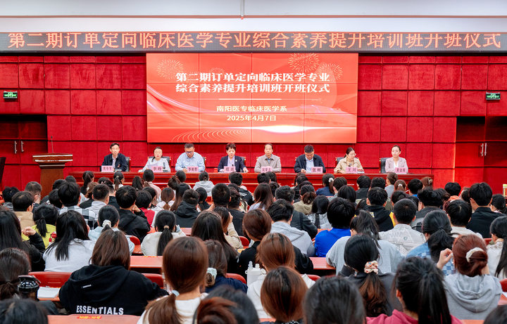 本网讯(文/临床医学系 周毕军)4月7日上午,南阳医专第二期订单定向临床医学专业综合素养提升培训开班仪式在图书馆五楼报告厅举行。校党委副书记、校长范真,校党委委员、副校长刘荣志出席,教务处、临床医学系相关部门领导及授课教师代表、第二期订单定向班全体学员参加。开班仪式由临床医学系主任李玲主持。