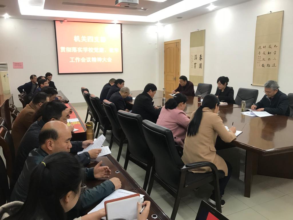 为深入贯彻落实学校党建、教学工作会议精神,南阳医专机关四支部于2019年3月26日上午,在行政楼3楼2号会议室召开专题会议,传达学习有关文件、会议精神。会议由校党委委员,副校长范真主持。机关四支部全体职工参加会议。
