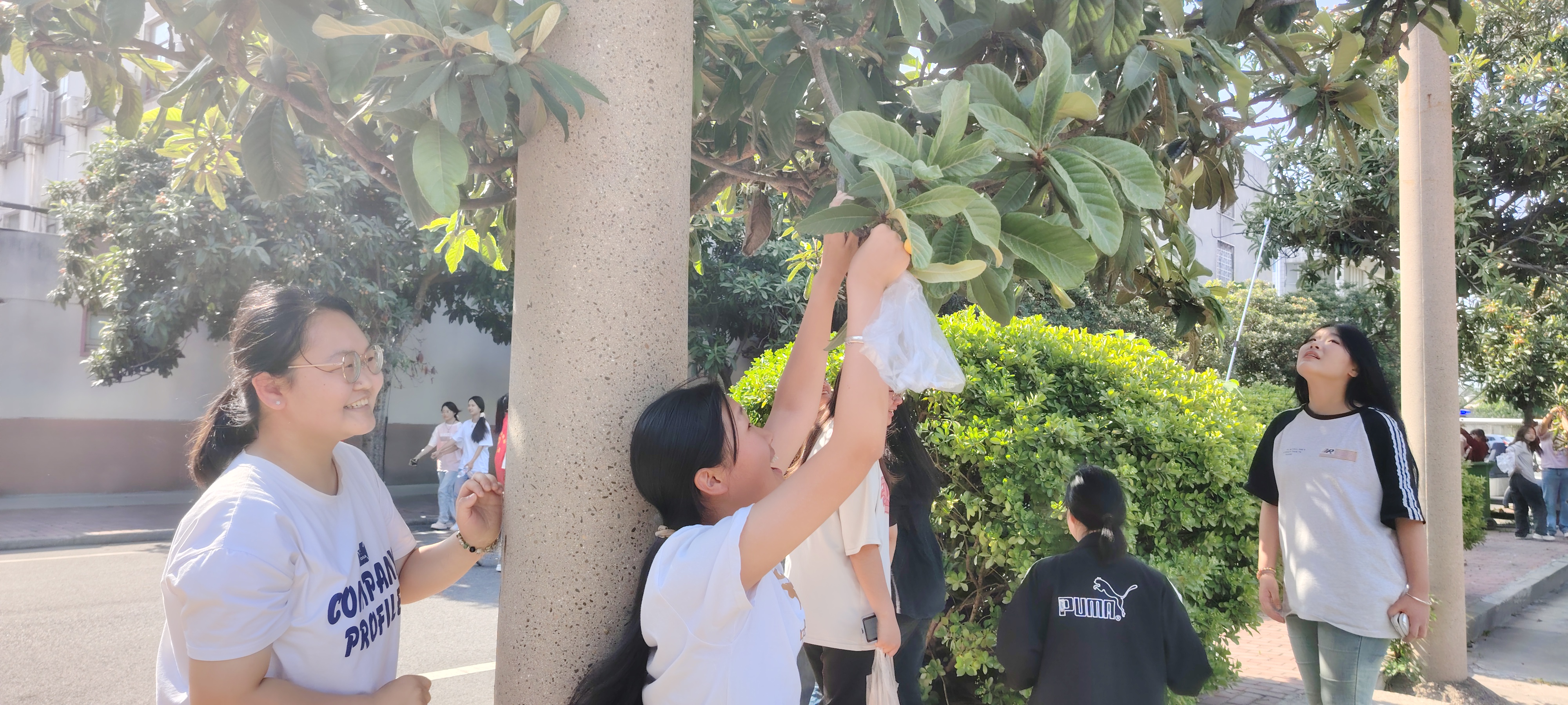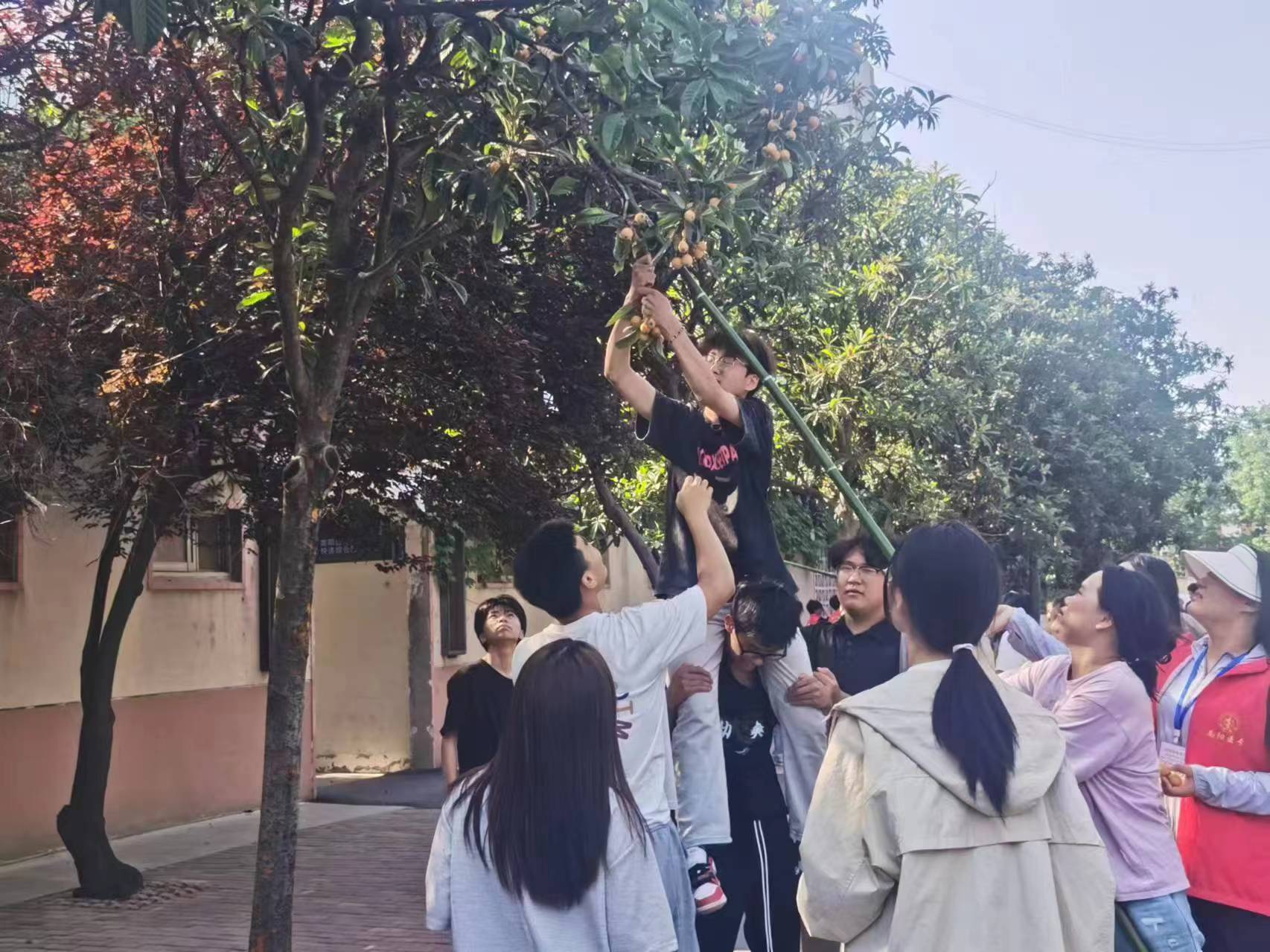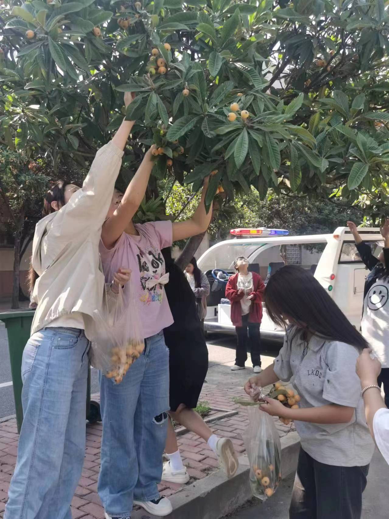在自由采摘环节,师生们纷纷拿着采摘工具,肆意穿梭在茂密的枇杷树下,采摘着颗颗金黄饱满的枇杷;有的直接在现场大快朵颐,一口下去,丝丝甜味沁人心脾,为味蕾和身体注入一份愉悦与活力。志愿者将采摘的枇杷送给保安、宿管阿姨、楼管叔叔等这些最可爱的人,以文明采摘和品尝向劳动致敬,让一颗颗枇杷甜在口中、乐在心头。