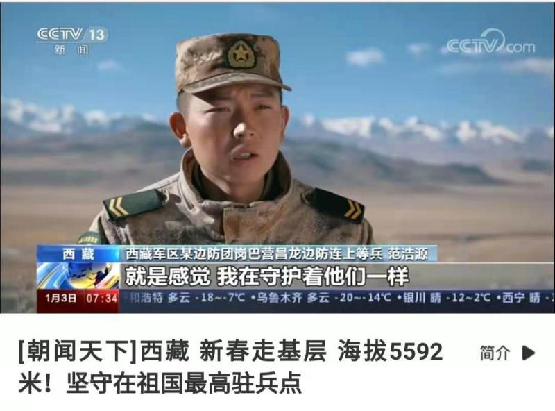 2021年1月3日中午,中央电视台新闻联播报道了“海拔5592米,坚守在祖国最高驻兵点”的驻守西藏某边防团哨所的先进事迹,新闻中正在观察哨执行观察任务的上等兵范浩源是我校临床医学系2017级口腔1班入伍学生。
