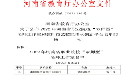 5月17日,河南省教育厅公布2022年河南省职业院校“双师型”名师工作室和教师技艺技能传承创新平台名单,我校黄川锋老师主持的临床医学专业“双师型”名师工作室获批立项。这是继3月份我校临床医学系教师党支部获批省级“双带头人”教师党支部书记工作室之后的又一成果。