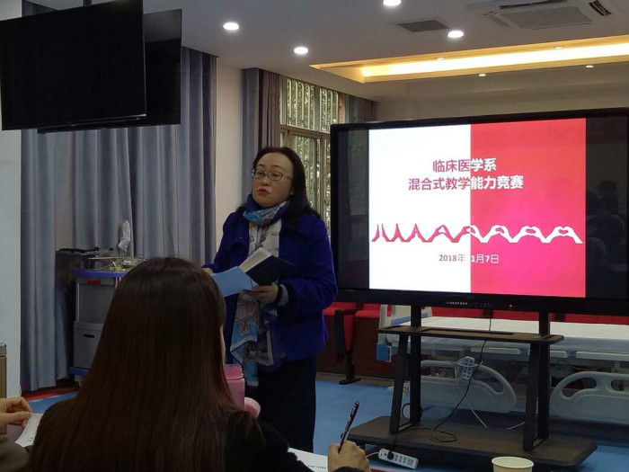 11月7日下午,临床医学系混合式课堂教学比赛在临床医学模拟中心多功能厅进行,七位青年教师参赛,王岩、艾娟等五位老师担任评委,我系全体教师现场观摩。