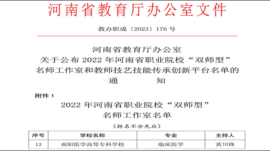 5月17日,河南省教育厅公布2022年河南省职业院校“双师型”名师工作室和教师技艺技能传承创新平台名单,我校黄川锋老师主持的临床医学专业“双师型”名师工作室获批立项。这是继3月份我校临床医学系教师党支部获批省级“双带头人”教师党支部书记工作室之后的又一成果。