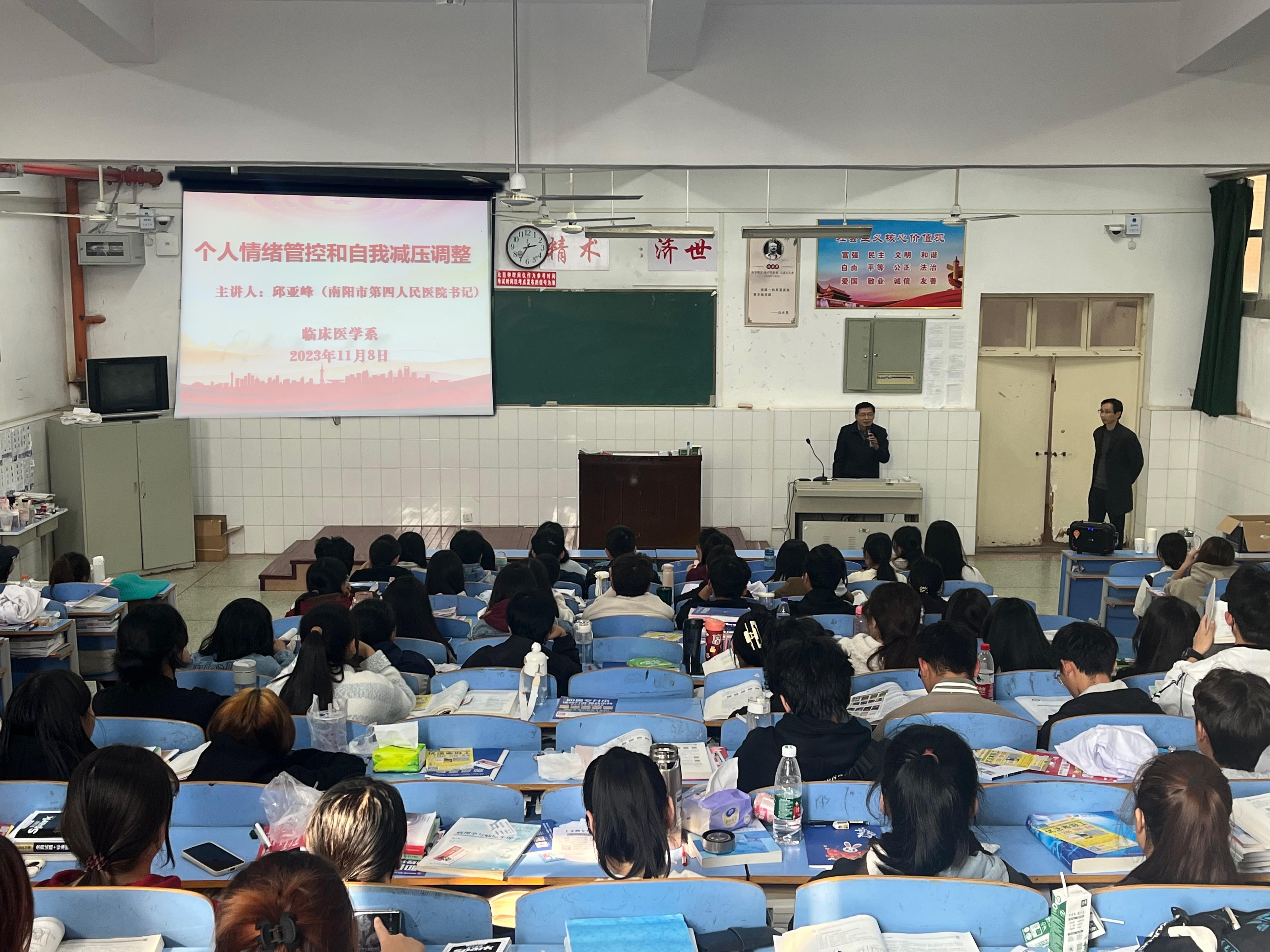 为推动学习贯彻习近平新时代中国特色社会主义思想主题教育走深走实,为师生办实事好事,11月8日下午,临床医学系特邀南阳市第四人民医院党委书记邱亚峰开展了题为“个人情绪管控和自我减压调整”的专题讲座,受到师生的热烈欢迎和一致好评。