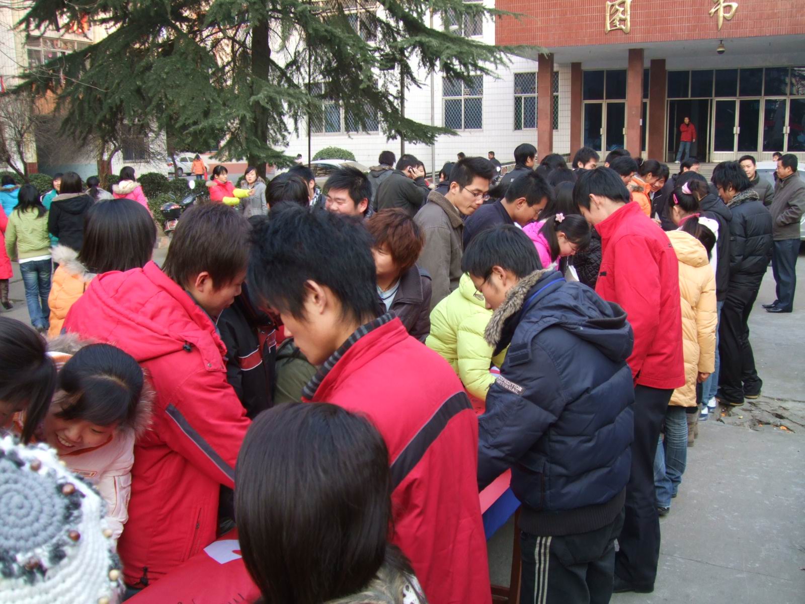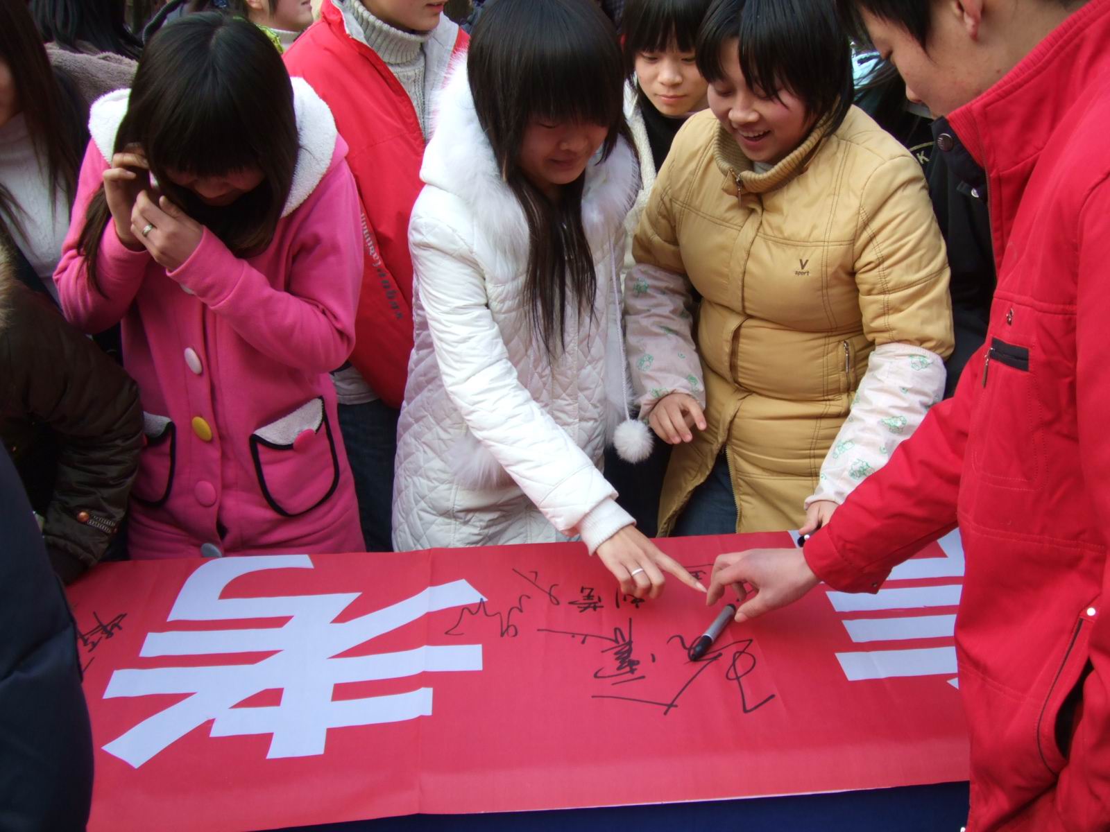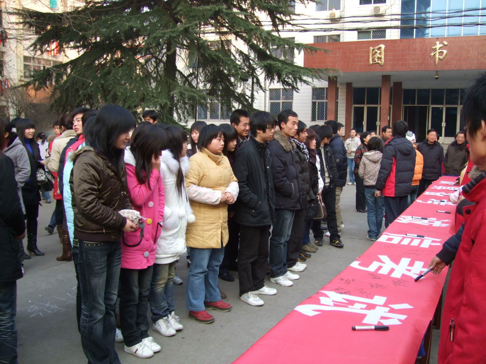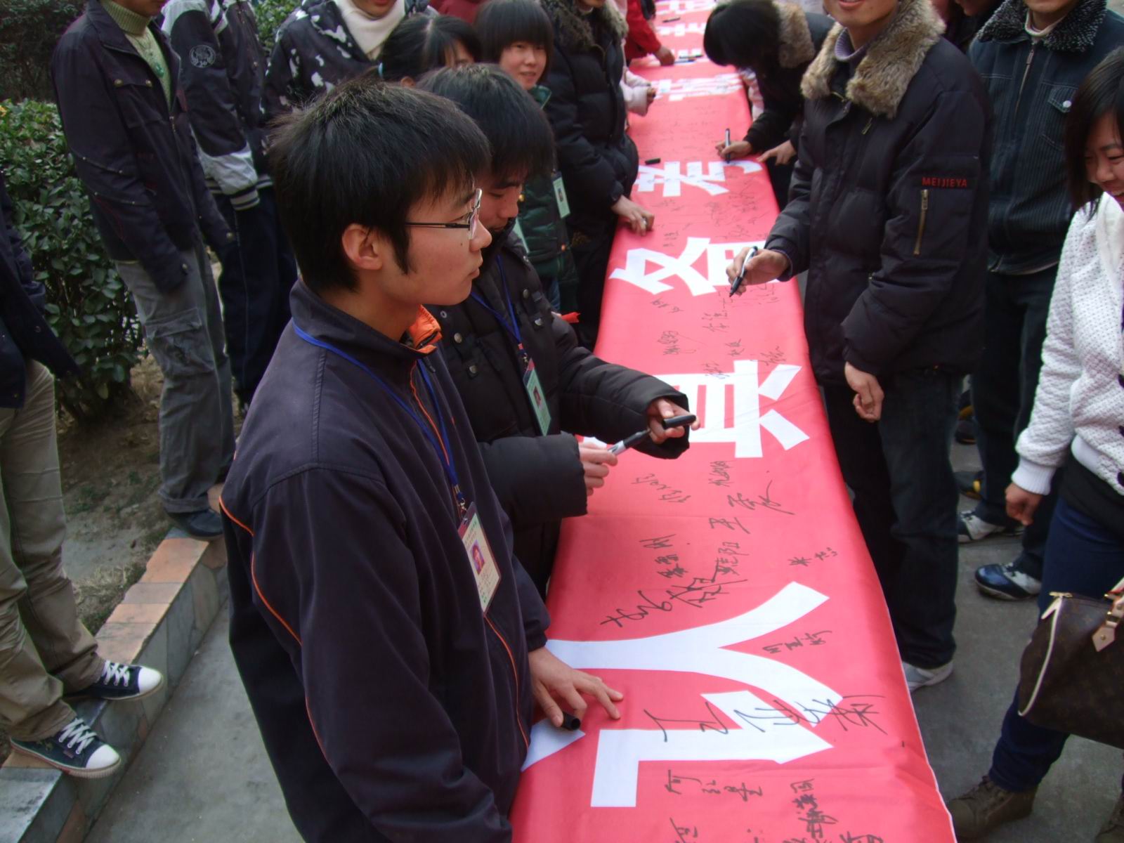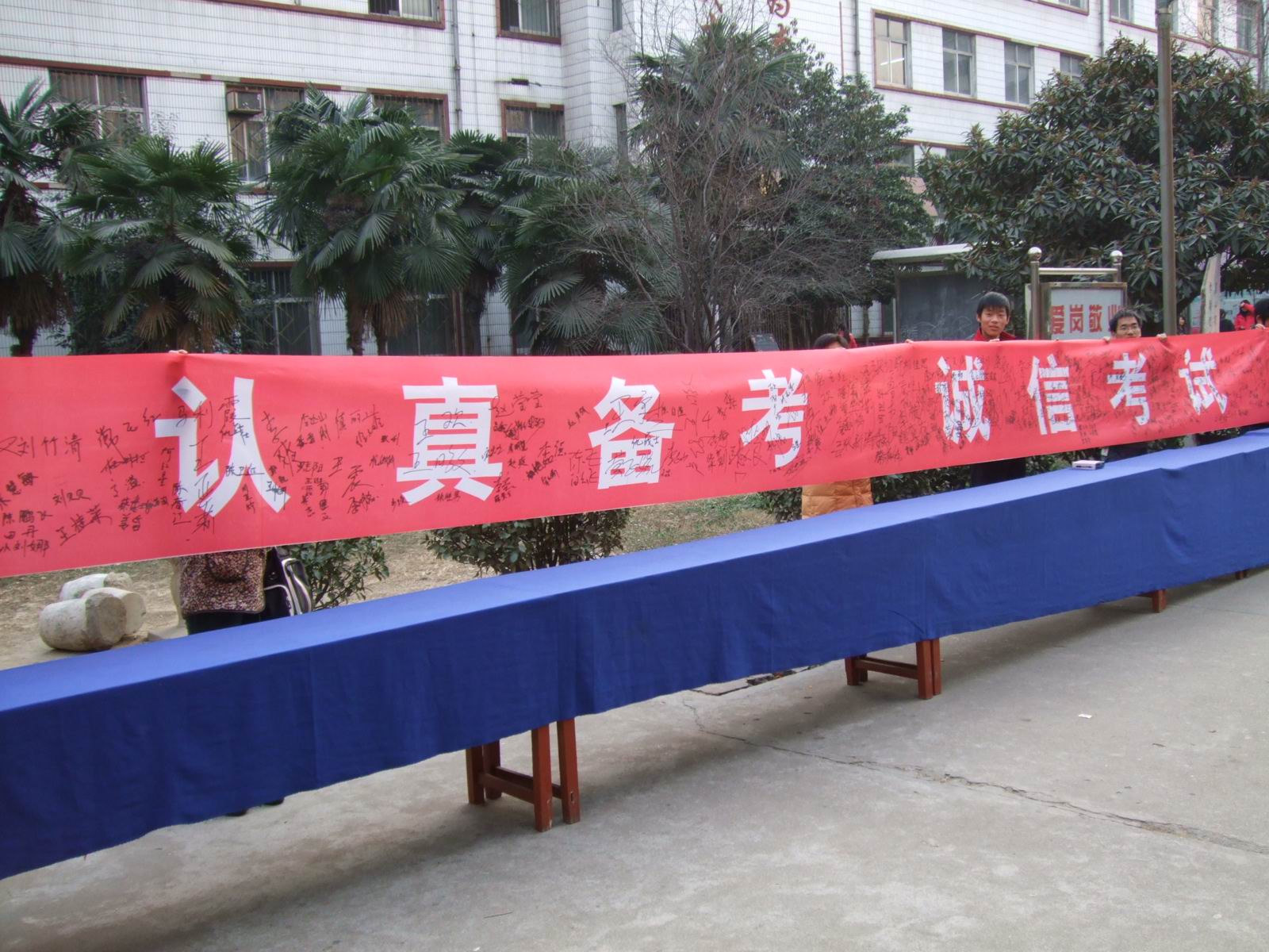 12月31日下午课外活动时,老校区教学楼前,一条印有“积极备考 诚信应试”的条幅在几张长桌上一字排开。下课后的同学们纷纷拥来,郑重签下自己的名字。同时也留下了铮铮誓言,表示一定要诚信做人,认真备考,拒绝舞弊。